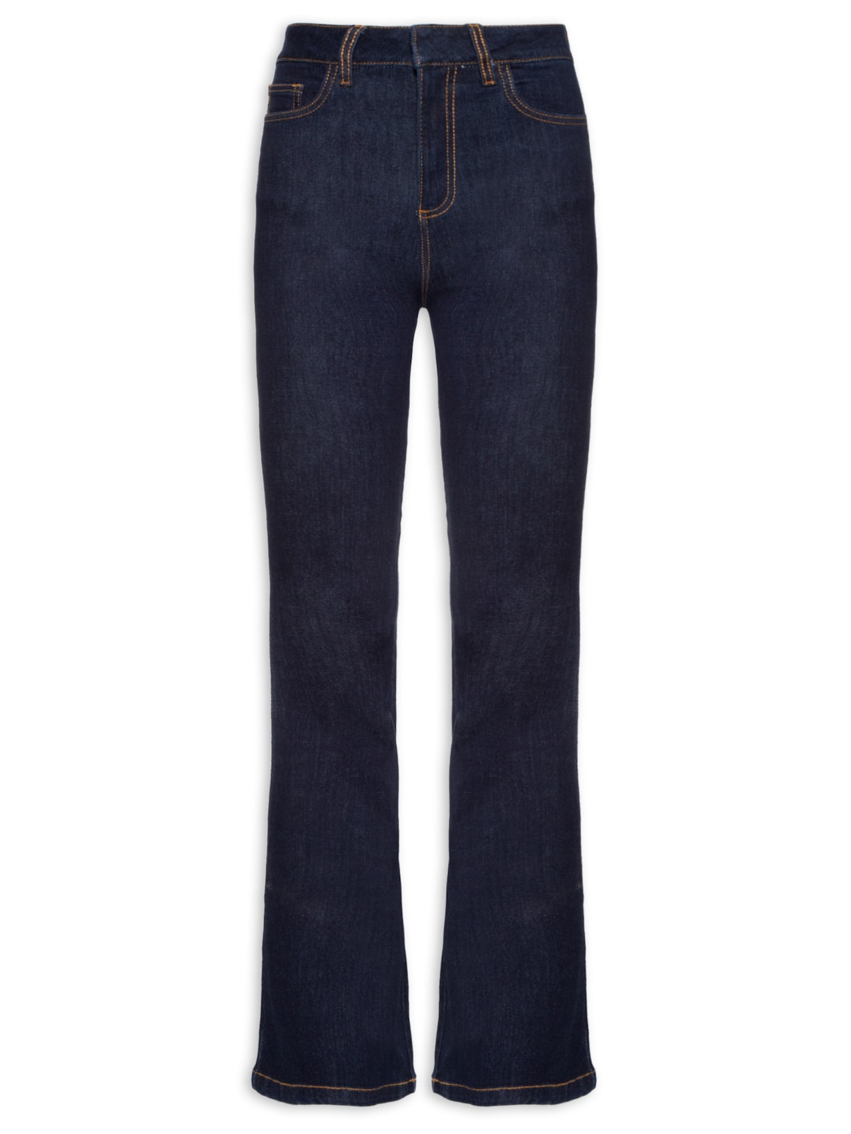 A calça azul é confeccionada em sarja com lavagem jeans de baixa elasticidade. A peça justa ao corpo, possui cintura alta, cós com passantes aplicados, five pockets*, tag da marca aplicada na parte posterior do cós, recortes posteriores, comprimento longo e fechamento frontal por zíper e botão.