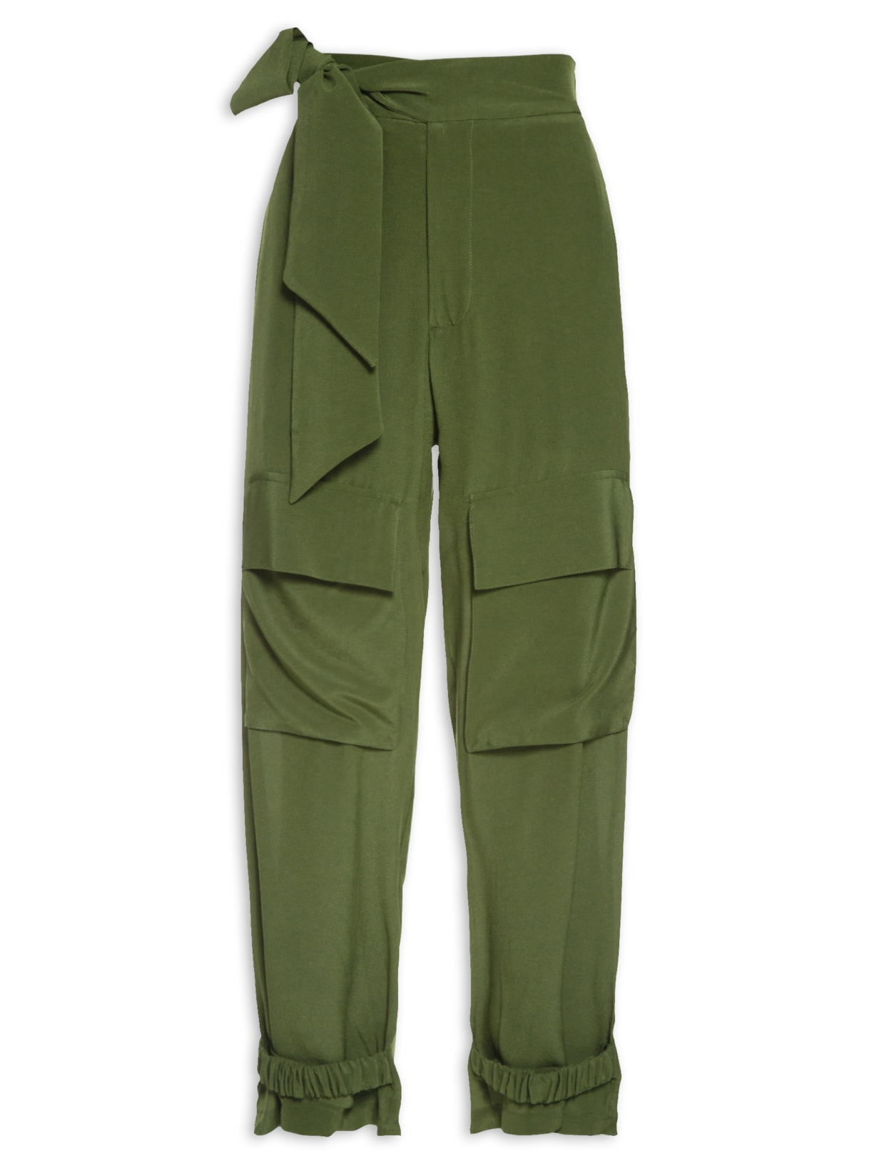 A calça verde é confeccionada em tecido leve. A peça possui cintura alta, cós com elástico embutido na parte posterior, logo da marca aplicado em metal na parte posterior na altura do cós, bolsos frontais embutidos, dois bolsos frontais com fechamento por aba, faixas sobrepostas na altura das barras na parte frontal com detalhe de elástico embutido, comprimento cropped*, shape solto, caimento reto e acabamento pespontado.