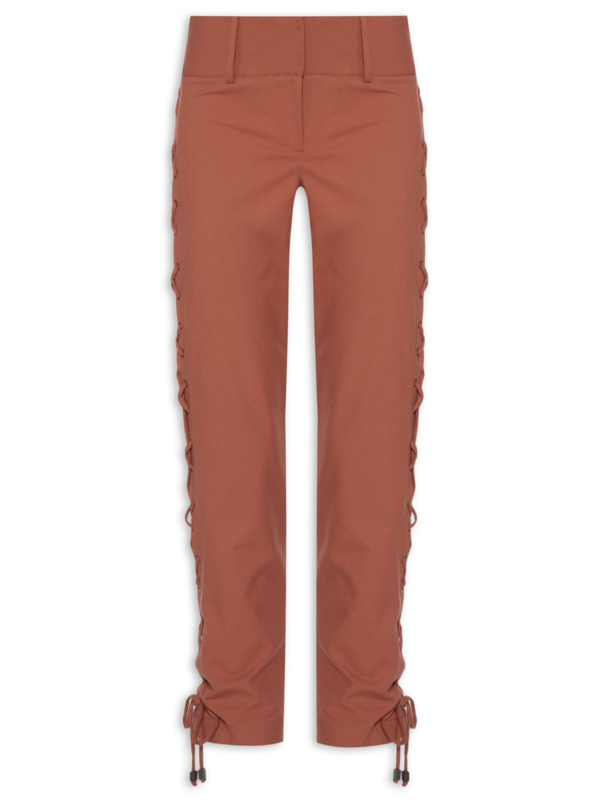 A calça marrom é confeccionada em tecido leve sem elasticidade. A peça solta ao corpo possui cintura média, cós amplo com passantes aplicados, bolsos frontais e posteriores, ilhóses laterais com aplicação de cordões para ajuste, comprimento longo e fechamento frontal por colchetes e zíper.