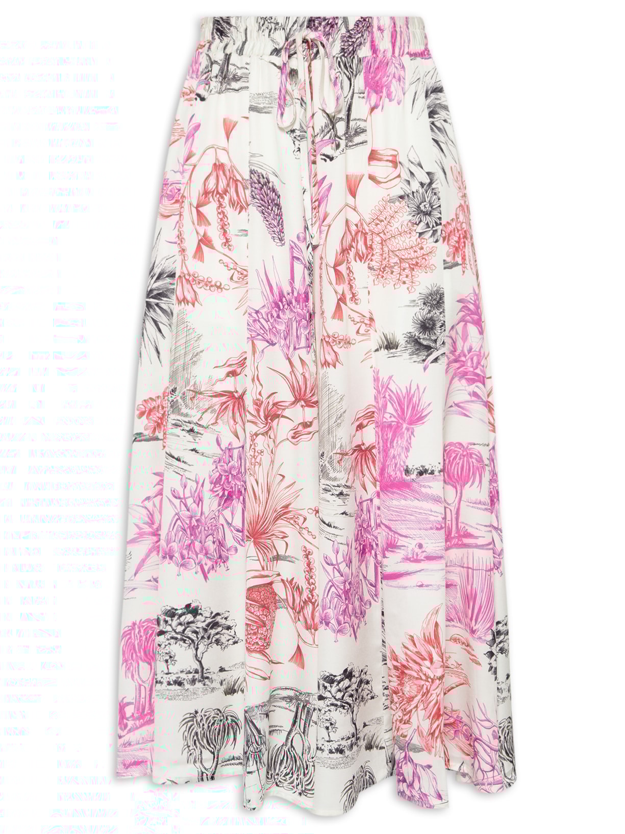 A calça branca é confeccionada em tecido leve sem elasticidade. A peça solta ao corpo possui cintura alta, cós com elástico e cordão embutidos, dois bolsos laterais, mix de estampa em cores contrastantes, comprimento midi, e forro.