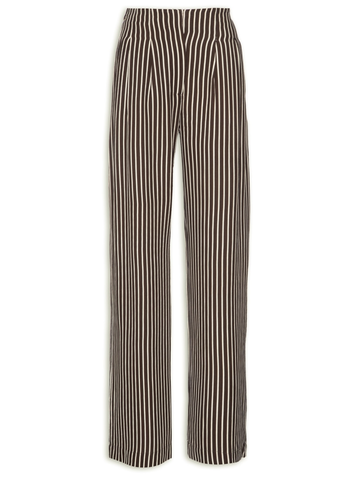 A calça marrom é confeccionada em tecido leve sem elasticidade. A peça solta ao corpo possui cintura alta, cós com elástico embutido na parte posterior, pregas frontais, bolsos frontais embutidos, estampa listrada na cor bege, comprimento longo e fechamento frontal por botões e zíper.