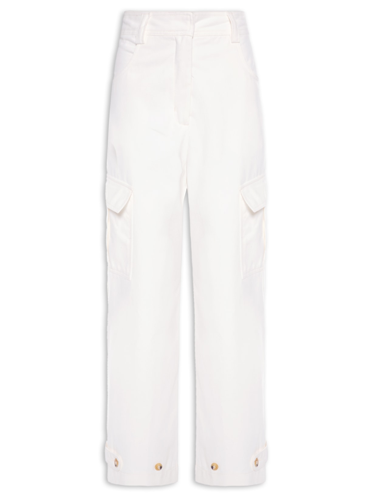 A calça off white é confeccionada em tecido leve. A peça possui cintura alta, cós com passantes, bolsos posteriores embutidos com fechamento por aba, bolsos frontais e laterais com fechamento por aba e detalhe de prega, detalhe de martingale e botão aplicado na parte frontal na altura da barra, comprimento longo, shape solto, caimento reto, acabamento pespontado e fechamento frontal por colchetes e zíper.
