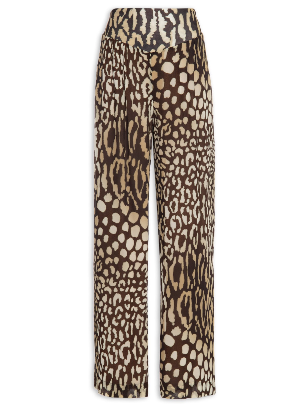 A calça animal print é confeccionada em crepe. A peça possui cintura alta, cós largo com recorte frontal e lastex embutido na parte posterior, detalhes de franzidos frontais, bolsos frontais de modelo faca, meio forro, comprimento longo, shape solto, caimento reto e acabamento pespontado.