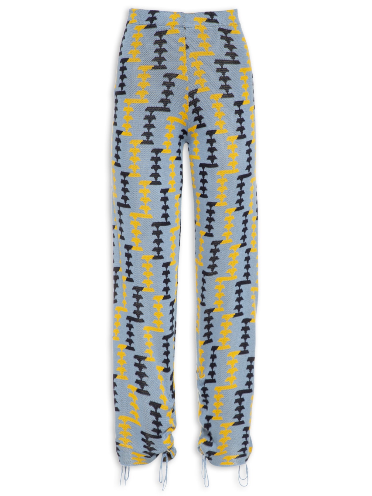 A calça azul é confeccionada em tricot jacquard. A peça possui cintura alta, cós com elástico embutido, detalhes laterais de franzidos ajustáveis por cordões embutidos na barra, comprimento cropped*, padronagem abstrata em cores contrastantes e shape solto.
