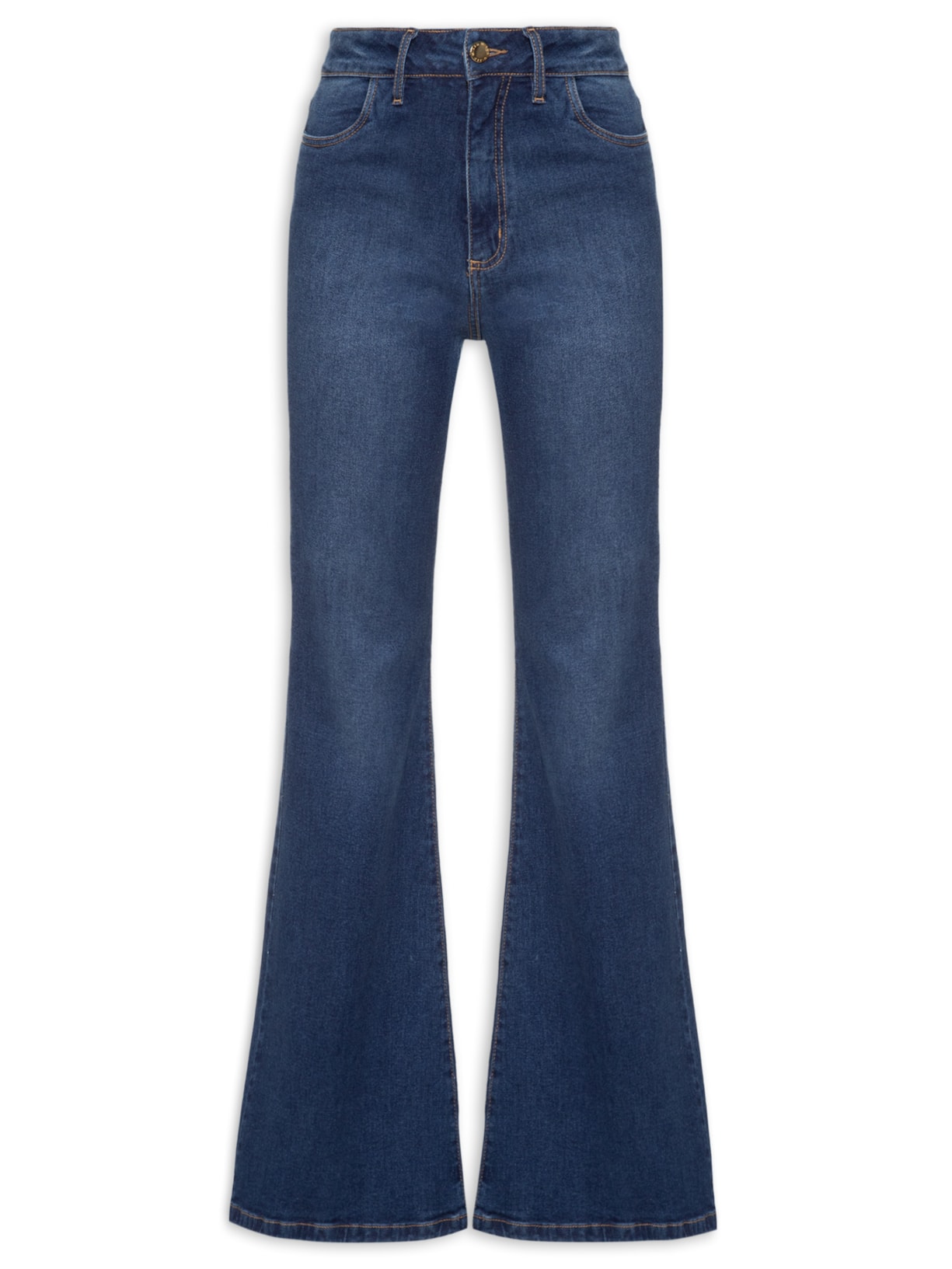 A calça azul é confeccionada em sarja com lavagem jeans e baixa elasticidade. A peça justa no quadril e solta no corpo de modelo flare* possui cintura alta, cós com passantes aplicados, bolsos frontais e bolsos posteriores, efeito levemente estonado, comprimento longo e fechamento frontal por botão e zíper.