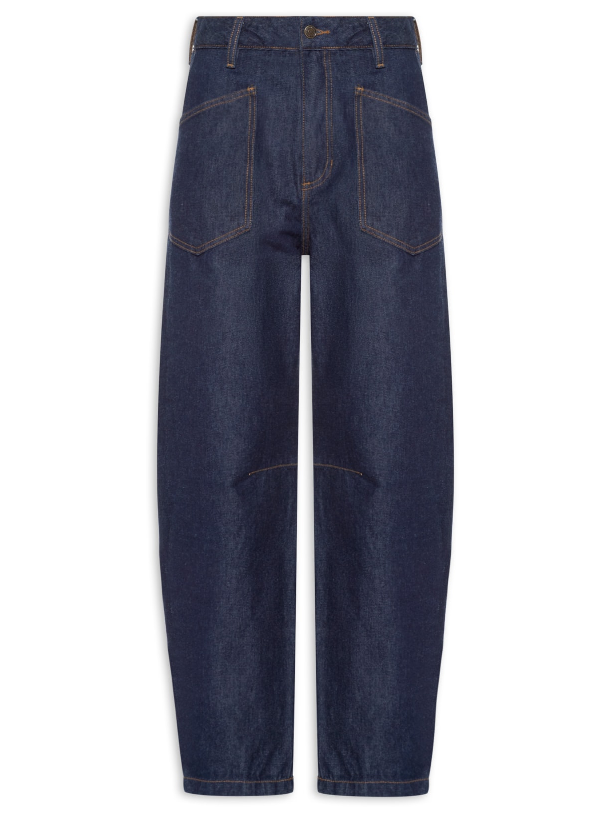 A calça azul é confeccionada em sarja com lavagem jeans sem elasticidade. A peça solta ao corpo possui cintura alta, cós com passantes aplicados, dois bolsos frontais, dois bolsos posteriores, efeito estonado, detalhe de pesponto frontal em linha marrom, comprimento cropped* e fechamento frontal por botão e zíper.