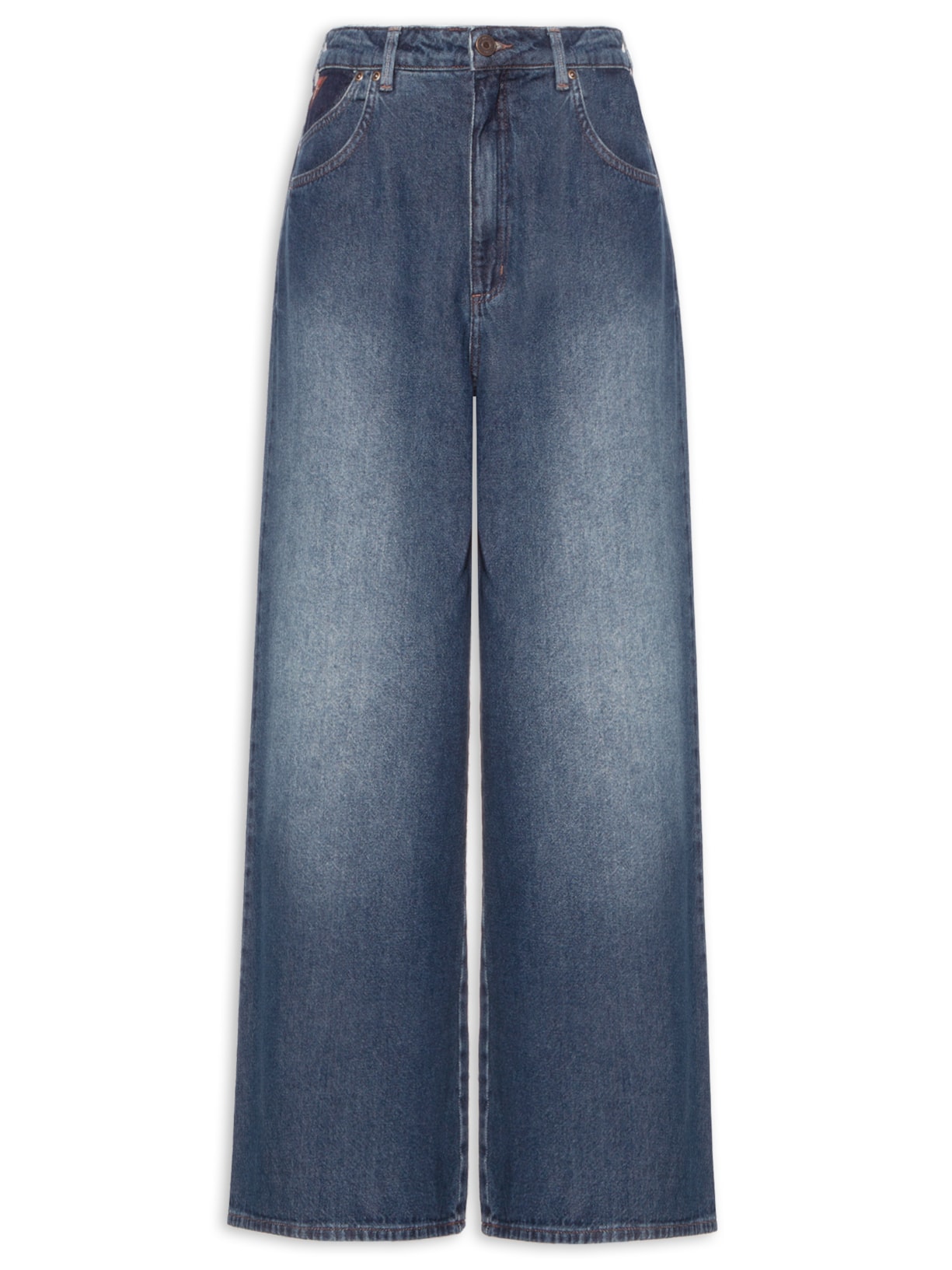A calça azul é confeccionada em sarja sem elasticidade. A peça de modelo baggy* solta ao corpo possui cintura alta, cós com passantes e tag da marca bordada na parte posterior, recorte posterior, five pockets** com detalhe de aplicações metalizadas nos bolsos posteriores, comprimento longo e fechamento frontal por botão e zíper.