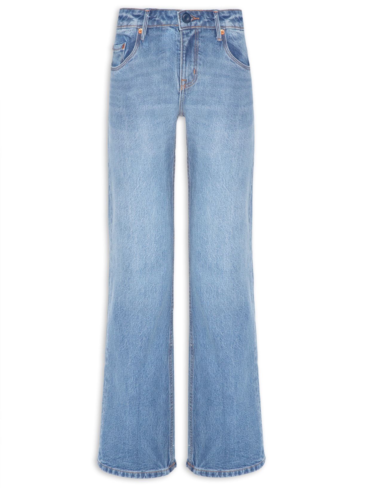 A calça azul é confeccionada em sarja com lavagem jeans e sem elasticidade. A peça solta ao corpo de modelo boot cut* possui cintura alta, cós com passantes aplicados, five pockets**, rebites frontais metalizados, efeito estonado e fechamento frontal por botão e zíper.