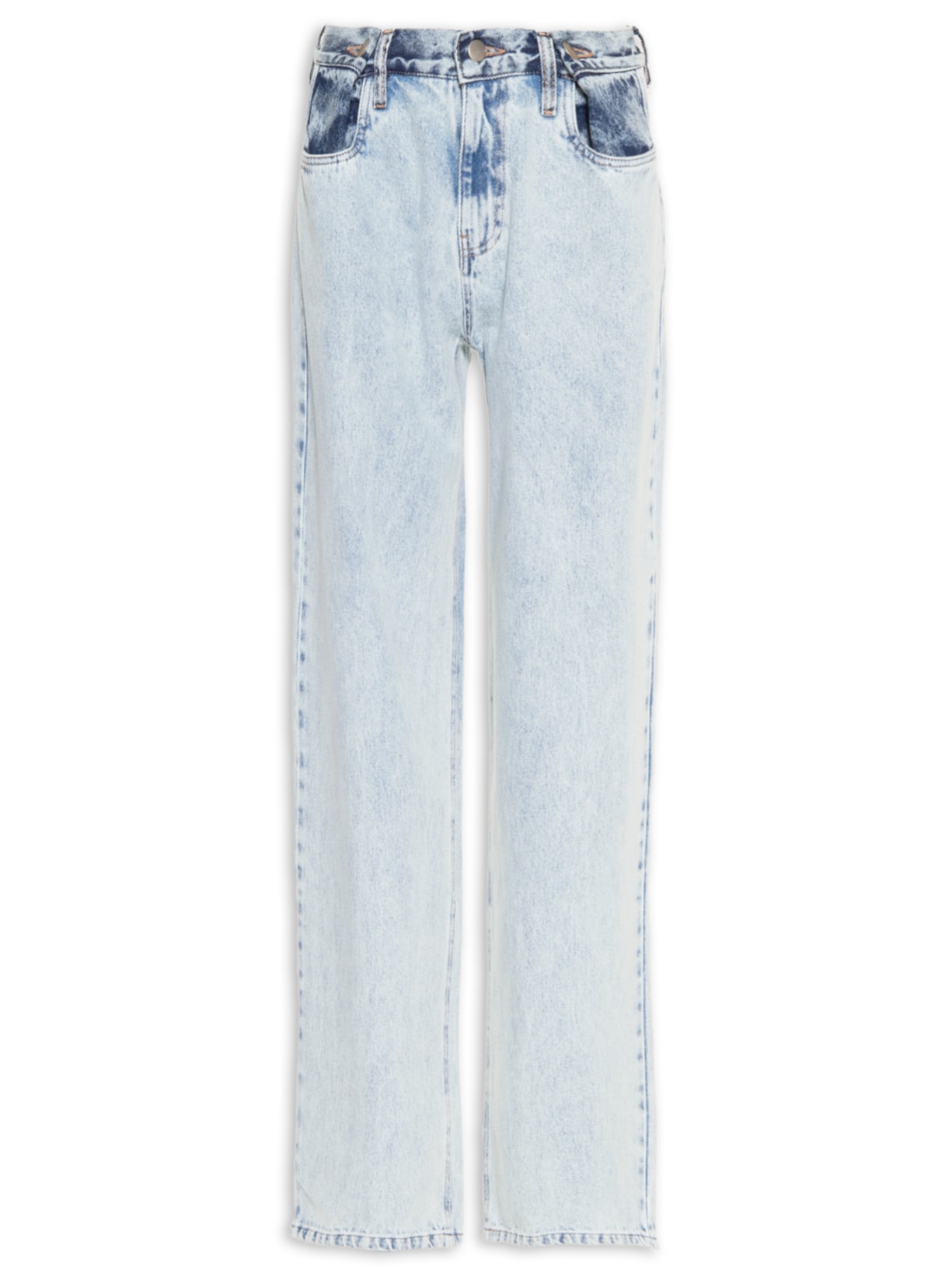 A calça azul é confeccionada em sarja com lavagem jeans sem elasticidade. A peça solta ao corpo possui cintura alta, cós com passantes aplicados e detalhes frontais de pregas com botões de pressão, bolsos frontais e posteriores, efeito delavê e estonado, comprimento longo e fechamento frontal por botão e zíper.