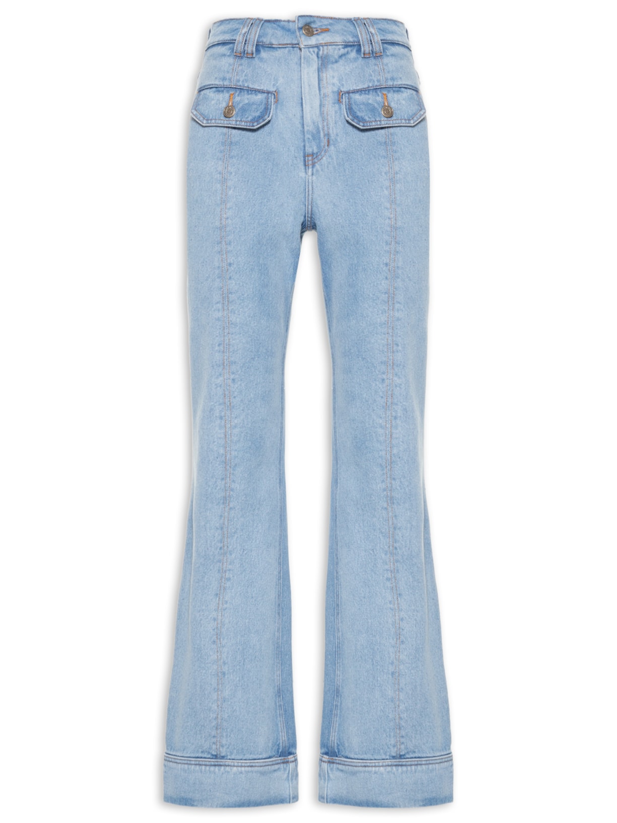 A calça azul é confeccionada em sarja com lavagem jeans. A peça de modelo flare* possui cintura alta, cós com passantes aplicados e tag da marca bordada na parte posterior, bolsos frontais com fechamento por aba sobreposta e botões, bolsos posteriores, recortes frontais e posteriores, comprimento longo, shape solto, caimento reto, acabamento pespontado e fechamento frontal por zíper e botão.