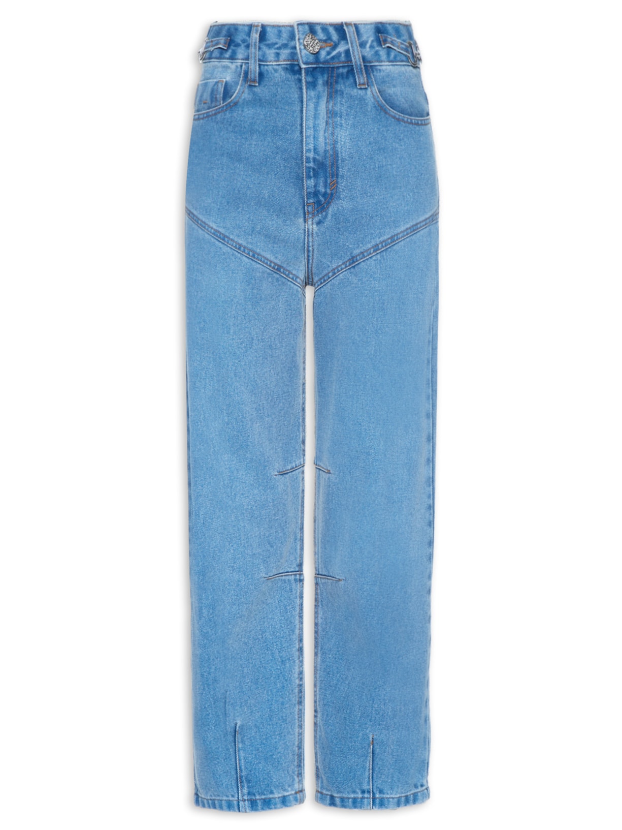 A calça azul é confeccionada em sarja com lavagem em jeans sem elasticidade. A peça solta ao corpo possui cintura alta, cós com passantes e tag da marca bordada na parte posterior, recorte posterior, five pockets*, detalhe de faixas finas sobrepostas nas partes laterais com aplicação metálica, efeito estonado, pences posteriores e frontais, recortes frontais, comprimento cropped* e fechamento frontal por botão e zíper.