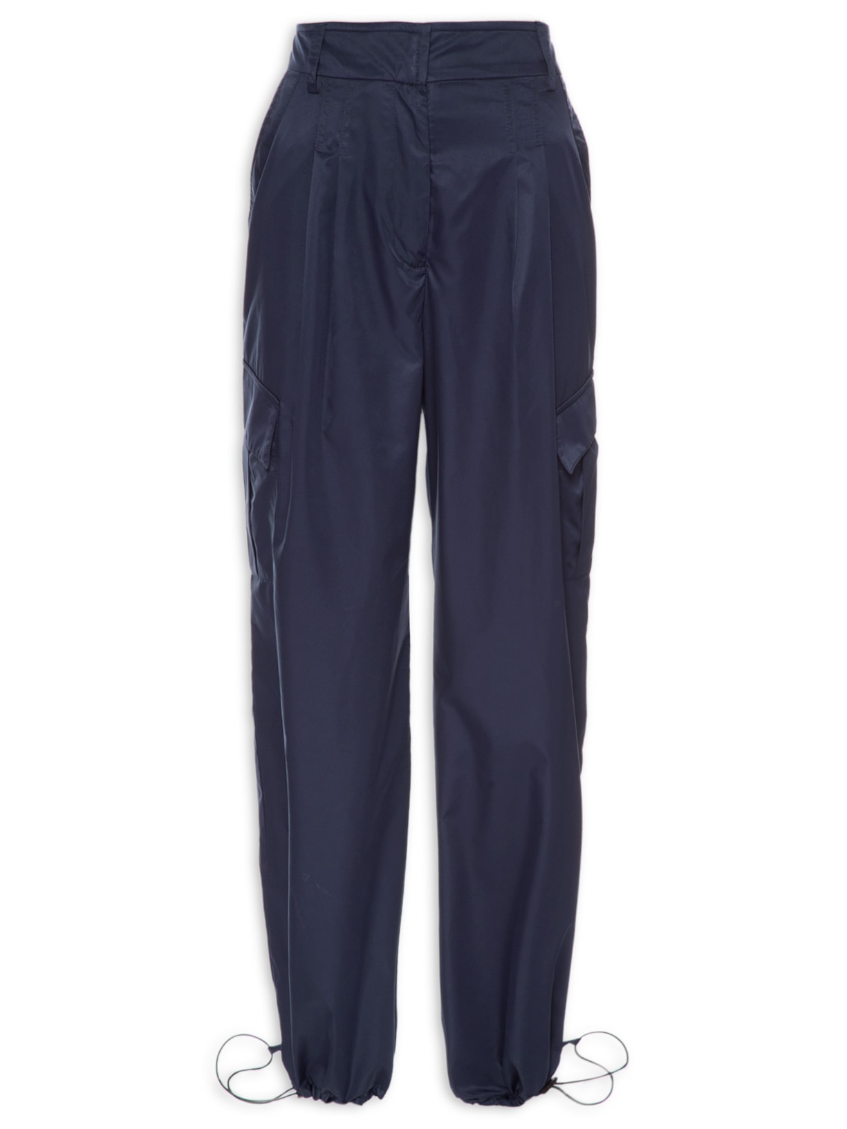 A calça azul marinho é confeccionada em tactel sem elasticidade. A peça de modelo jogger* solta ao corpo possui cintura alta, cós com passantes, fendas posteriores e pregas frontais na altura do cós, bolsos posteriores decorativos e frontais modelo faca, bolsos laterais modelo cargo, cordão embutido nas barras para ajuste lateral, comprimento longo e fechamento frontal por colchetes e zíper.
