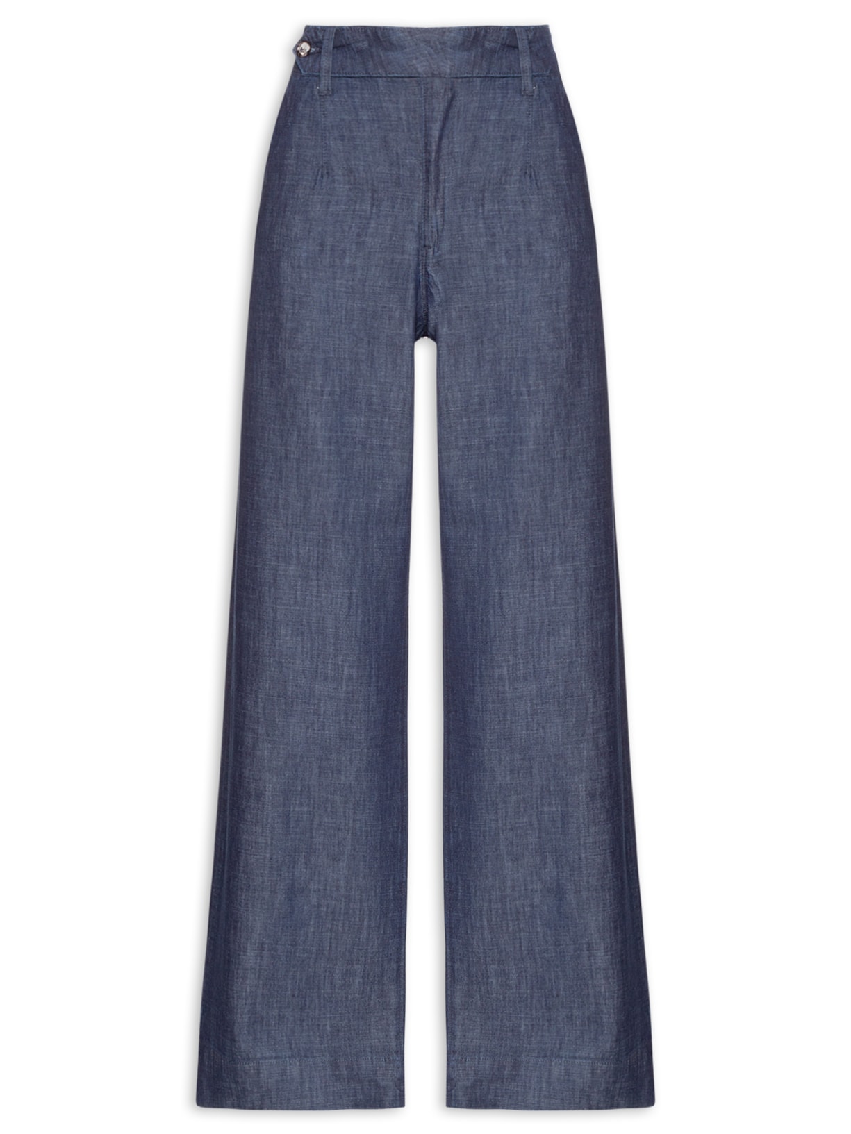 A calça azul marinho é confeccionada em sarja com lavagem em jeans sem elasticidade A peça solta ao corpo possui cintura alta, cós com passantes, pences posteriores e frontais, bolsos posteriores, logo da marca aplicado em metal no bolso posterior, bolsos frontais modelo faca, comprimento longo e fechamento frontal por botão com cristal e zíper.