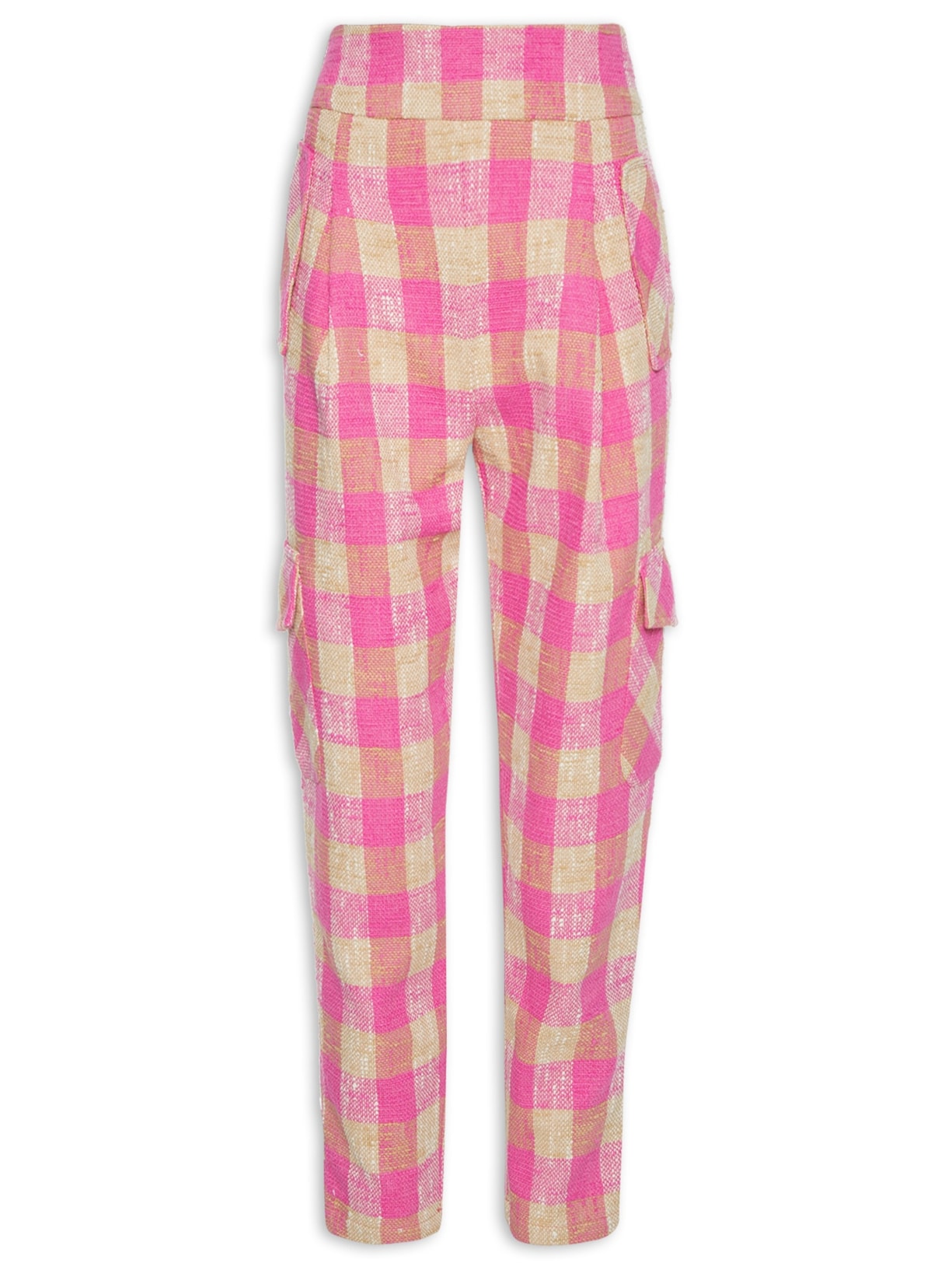 A calça rosa é confeccionada em tweed sem elasticidade. A peça solta ao corpo, possui cintura alta, cós largo com elástico embutido na parte posterior, bolsos frontais embutidos com aba aplicada, pregas frontais, bolsos utilitários nas laterais com fechamento por aba, bolso posterior decorativo com aba aplicada, tiras finas aplicadas na parte posterior da barra com botão decorativo, padronagem xadrez em cores contrastantes, comprimento longo e fechamento lateral por zíper metálico.