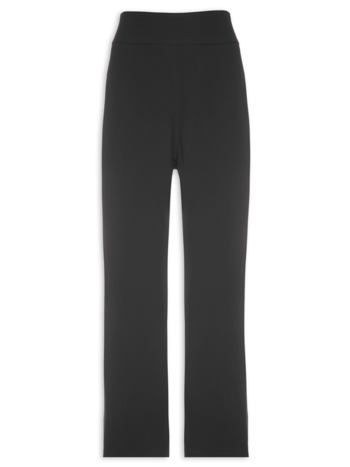 A calça preta é confeccionada em crepe. A peça possui cintura alta, recorte no cós, bolsos frontais embutidos, pequenas fendas na barra, shape solto, caimento reto, acabamento pespontado e fechamento lateral por zíper invisível