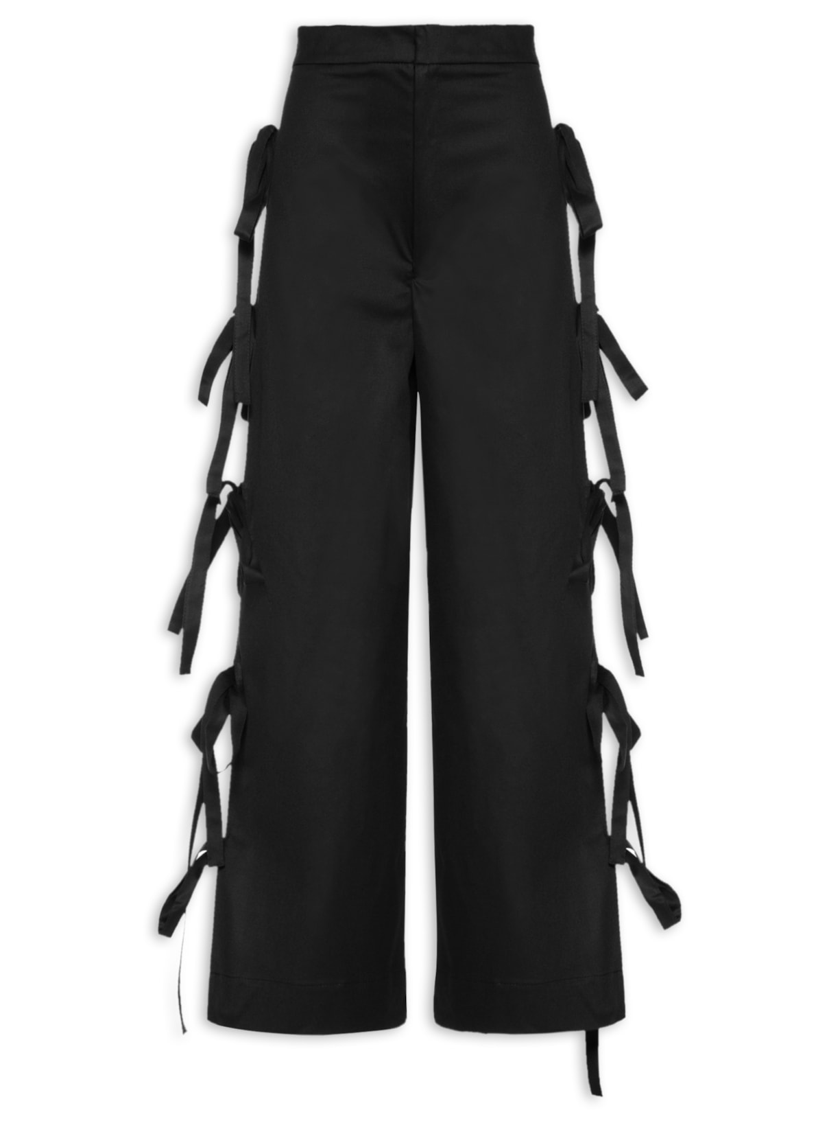 A calça preta é confeccionada em tecido leve sem elasticidade. A peça solta ao corpo possui cintura alta, pences posteriores, fendas laterais com faixas alongadas para amarração, comprimento longo e fechamento frontal por colchetes e zíper.