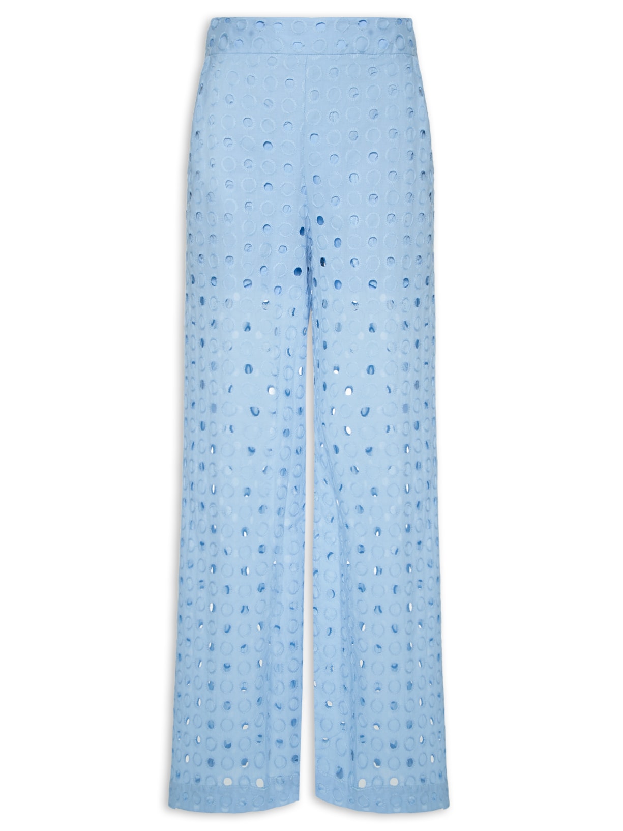 A calça azul é confeccionada em laise sem elasticidade. A peça solta ao corpo possui cintura alta, cós com elástico embutido na parte posterior, bolsos posteriores, bolsos frontais modelo faca, transparência, meio forro e comprimento longo.