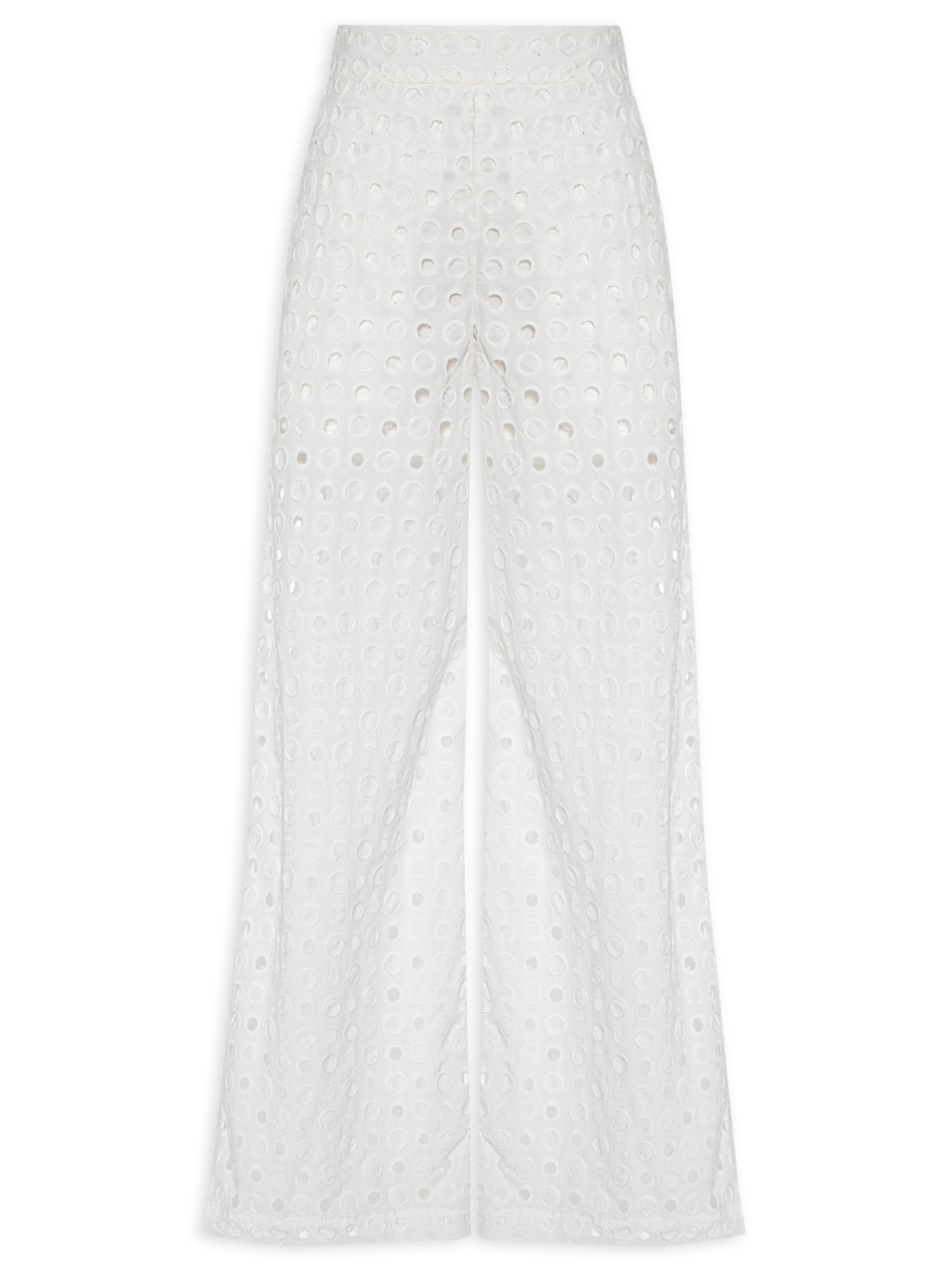 A calça branca é confeccionada por laise sem elasticidade. A peça solta ao corpo possui cintura alta, elástico embutido no cós, bolsos frontais no modelo faca, bolsos posteriores, leve transparecia, forro, fechamento posterior por zíper e comprimento longo.