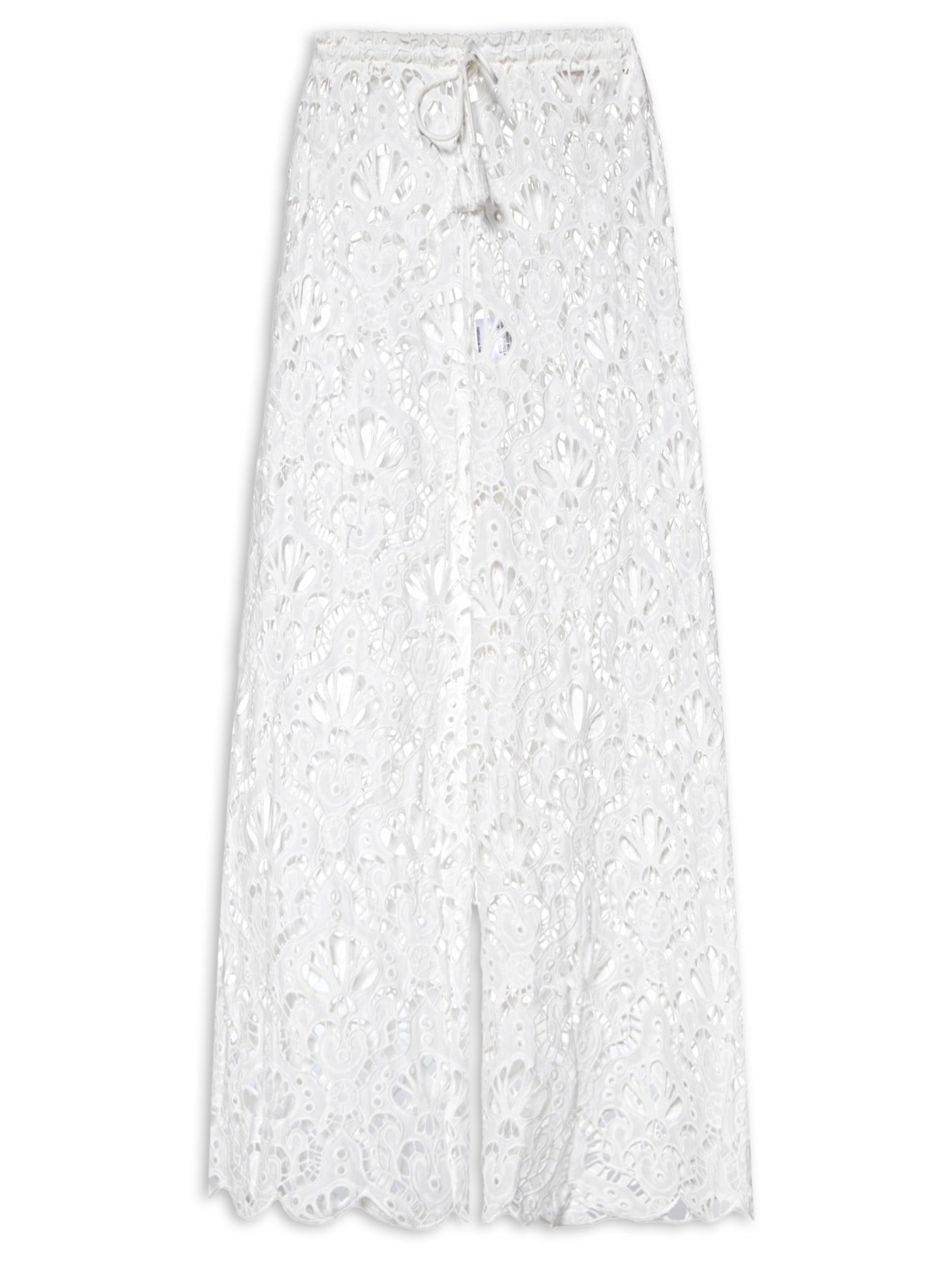 A calça branca é confeccionada em laise sem elasticidade. A peça solta ao corpo possui cintura alta, elástico embutido no cós com cordão para amarração, padronagem em conchas com recortes vazados, transparência e comprimento longo.