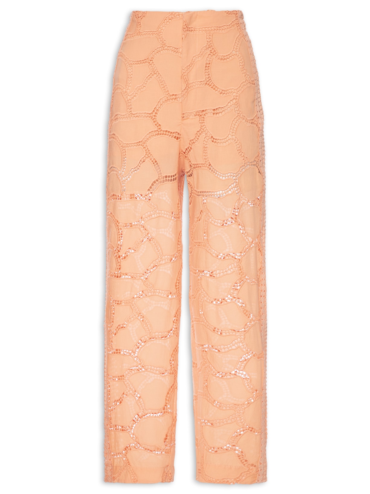 A calça laranja é confeccionada em laise sem elasticidade. A peça solta ao corpo possui cintura alta, pences posteriores, meio forro, transparência, comprimento cropped* e fechamento frontal por botão, colchetes e zíper.