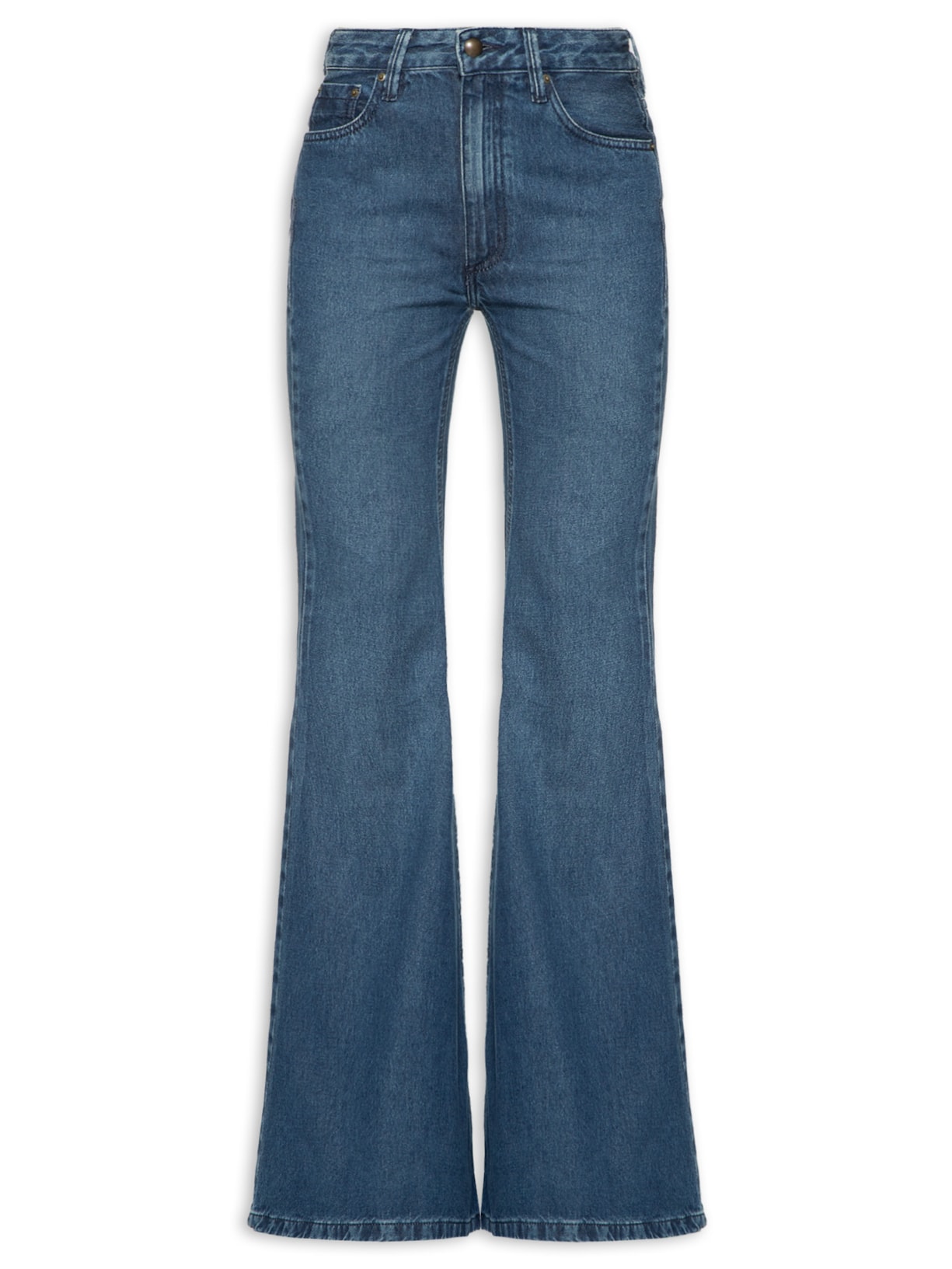 A calça azul é confeccionada em sarja com lavagem jeans sem elasticidade. A peça solta ao corpo de modelo flare* possui cintura alta, cós com passantes aplicados, five pockets**, recorte posterior, logo da marca bordado em tom contrastante na parte posterior, comprimento longo e fechamento frontal em zíper e botão.