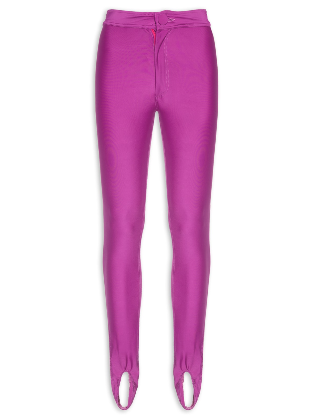 A calça roxa é confeccionada em malha de poliamida. A peça de modelo legging possui cintura alta, bolsos posteriores, barra com abertura para os pés, comprimento longo, shape justo, caimento reto, acabamento pespontado e fechamento frontal por zíper e botão.