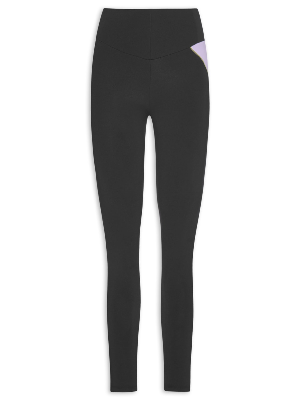 A calça preta é confeccionada em malha de poliamida com média elasticidade. A peça justa ao corpo de modelo legging possui cintura alta, cós largo com elástico embutido e bolso embutido de modelo envelope na parte posterior, logo da marca aplicado na parte posterior, recortes laterais na cor lilás com nome da marca aplicado e detalhe em acabamento overlocado na cor verde e comprimento longo.