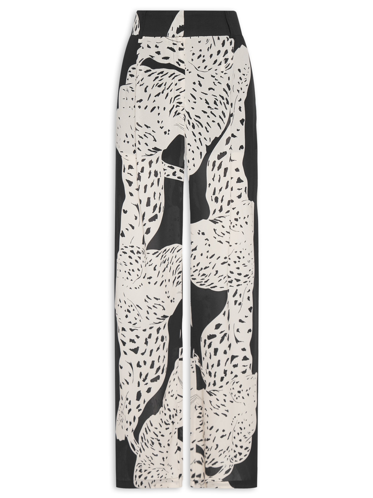 A calça preta é confeccionada em tecido leve sem elasticidade. A peça solta ao corpo possui cintura alta, cós com passantes aplicados, estampa figurativa de pantera na cor branca, leve transparência, forro, comprimento longo, e fechamento frontal por zíper e colchete.