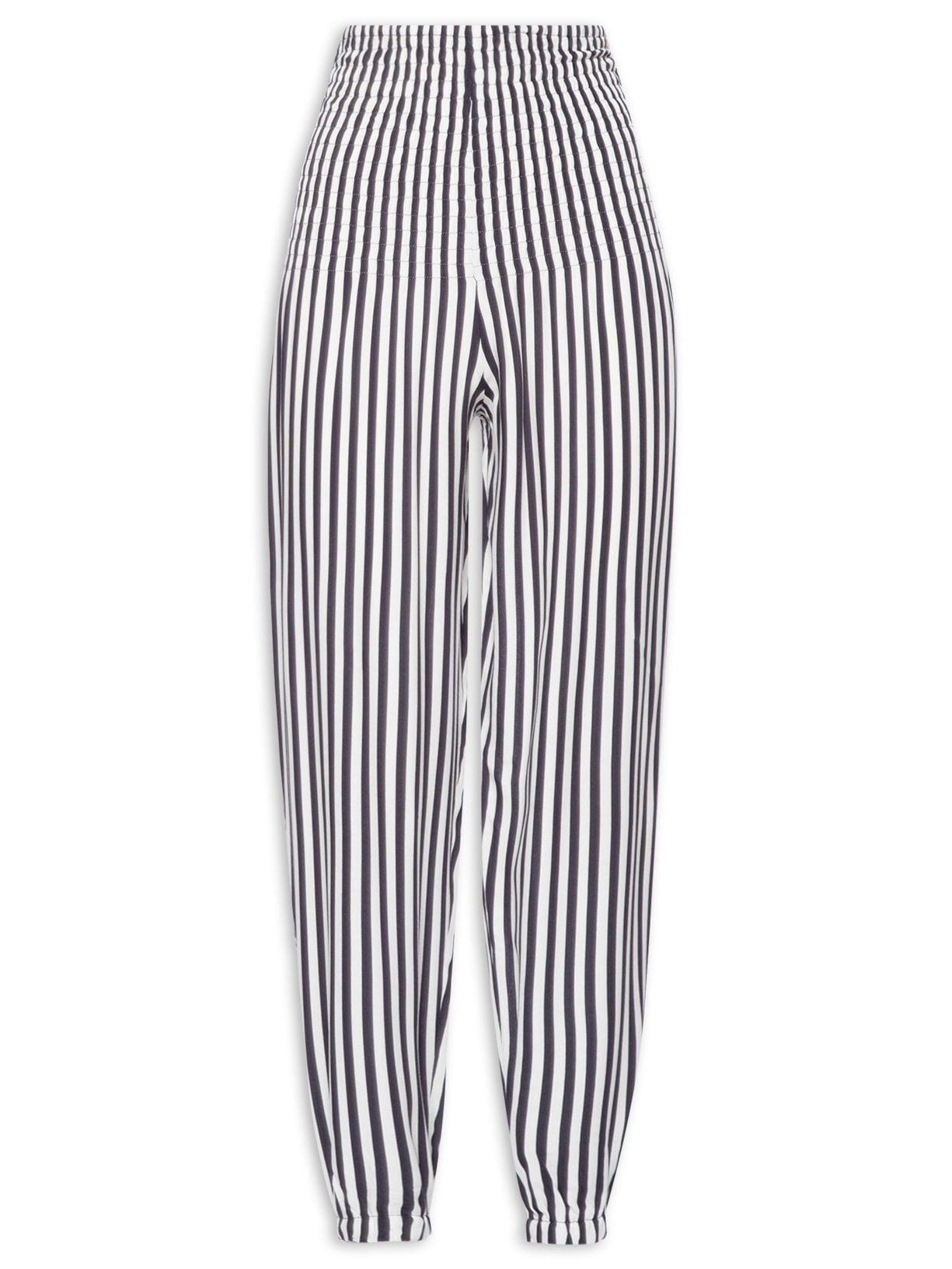 A calça azul marinho é confeccionada em tecido leve sem elasticidade. A peça solta ao corpo de modelo jogger* possui cintura alta, cós estendido com aplicação de lastex, padronagem listrada na cor branca e comprimento longo.