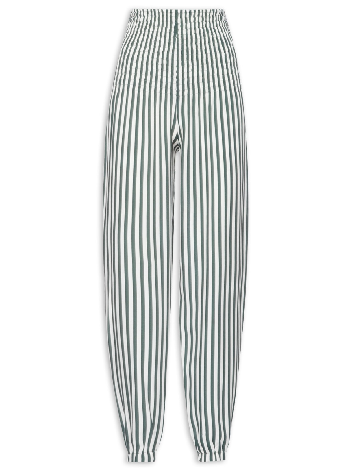 A calça verde é confeccionada em tecido leve sem elasticidade. A peça solta ao corpo de modelo jogger* possui cintura alta, cós estendido com aplicação de lastex, padronagem listrada na cor branca e comprimento longo.