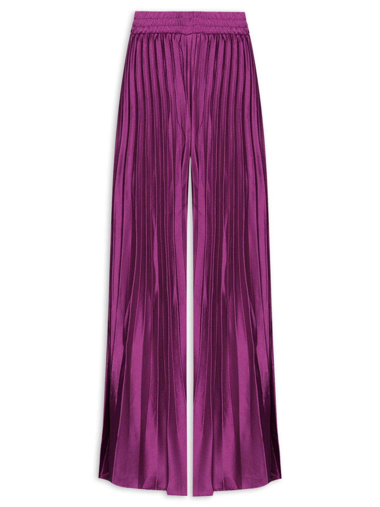 A calça roxa é confeccionada em tecido leve com superfície acetina e efeito plissado. A peça solta ao corpo de modelo pantalona possui cintura alta, cós com elástico embutido e comprimento longo.