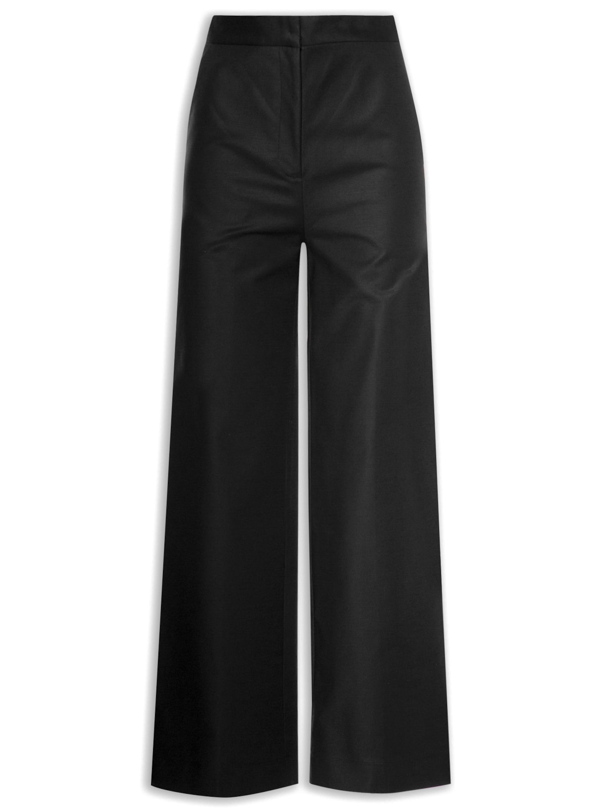 A calça preta é confeccionada em tecido encorpado de baixa elasticidade. A peça solta ao corpo, de modelo semi wide*, possui cintura alta, bolsos faca frontais, pences posteriores, barra alongada, comprimento longo e fechamento frontal por zíper e colchetes.