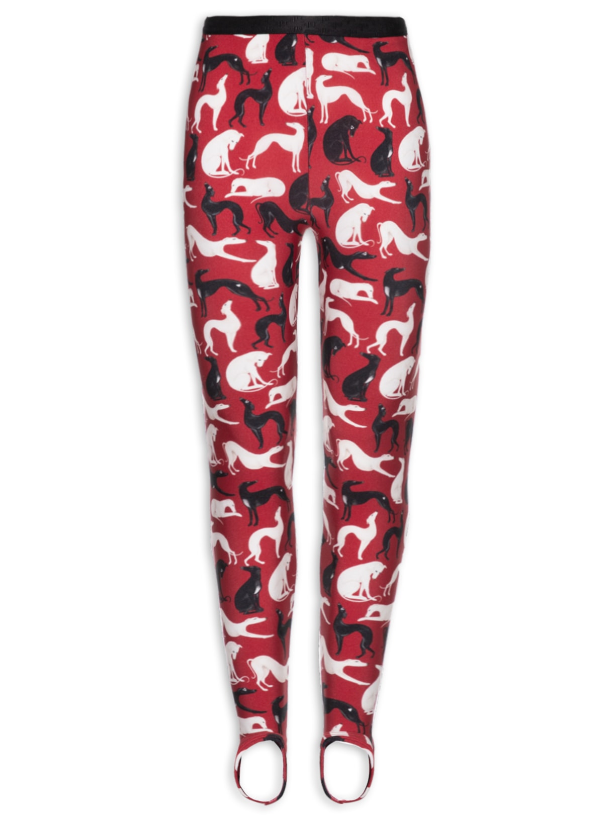 A calça vermelha é confeccionada em malha cirrê de média elasticidade. A peça justa ao corpo de modelo fuseau* possui cintura alta, cós elástico em cor contrastante com logomania da marca, estampa figurativa de cachorros em cores contrastantes e comprimento longo.