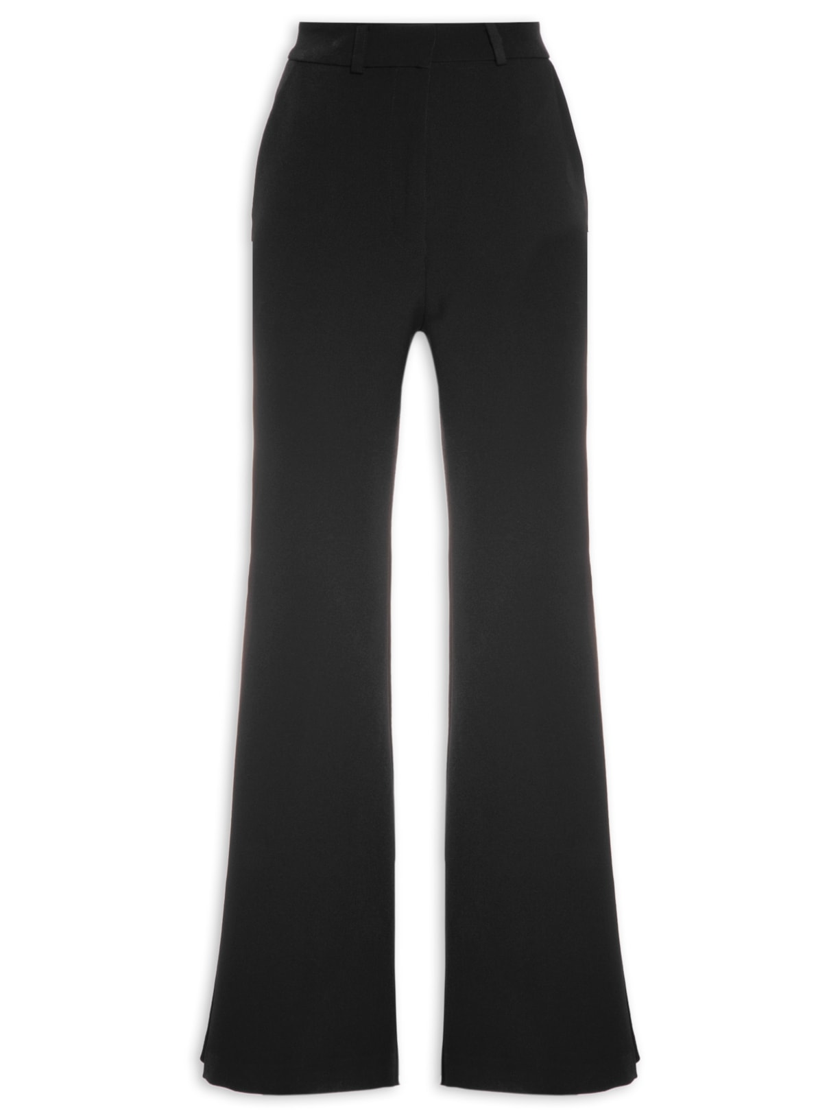 A calça preta é confeccionada em tecido leve. A peça de modelo flare possui cintura alta, cós com passantes aplicados, bolsos frontais modelo faca, bolso posterior decorativo, recorte lateral, shape solto, caimento reto, acabamento pespontado e fechamento frontal por zíper e colchetes.