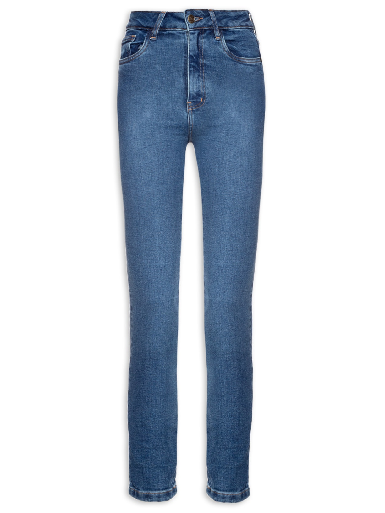 A calça azul é confeccionada em sarja com lavagem em jeans com baixa elasticidade. A de modelo skinny* possui cintura alta, cós com passantes, recorte posterior, five pockets** com detalhe de rebites na parte frontal, estonado, comprimento longo e fechamento frontal por botão e zíper.