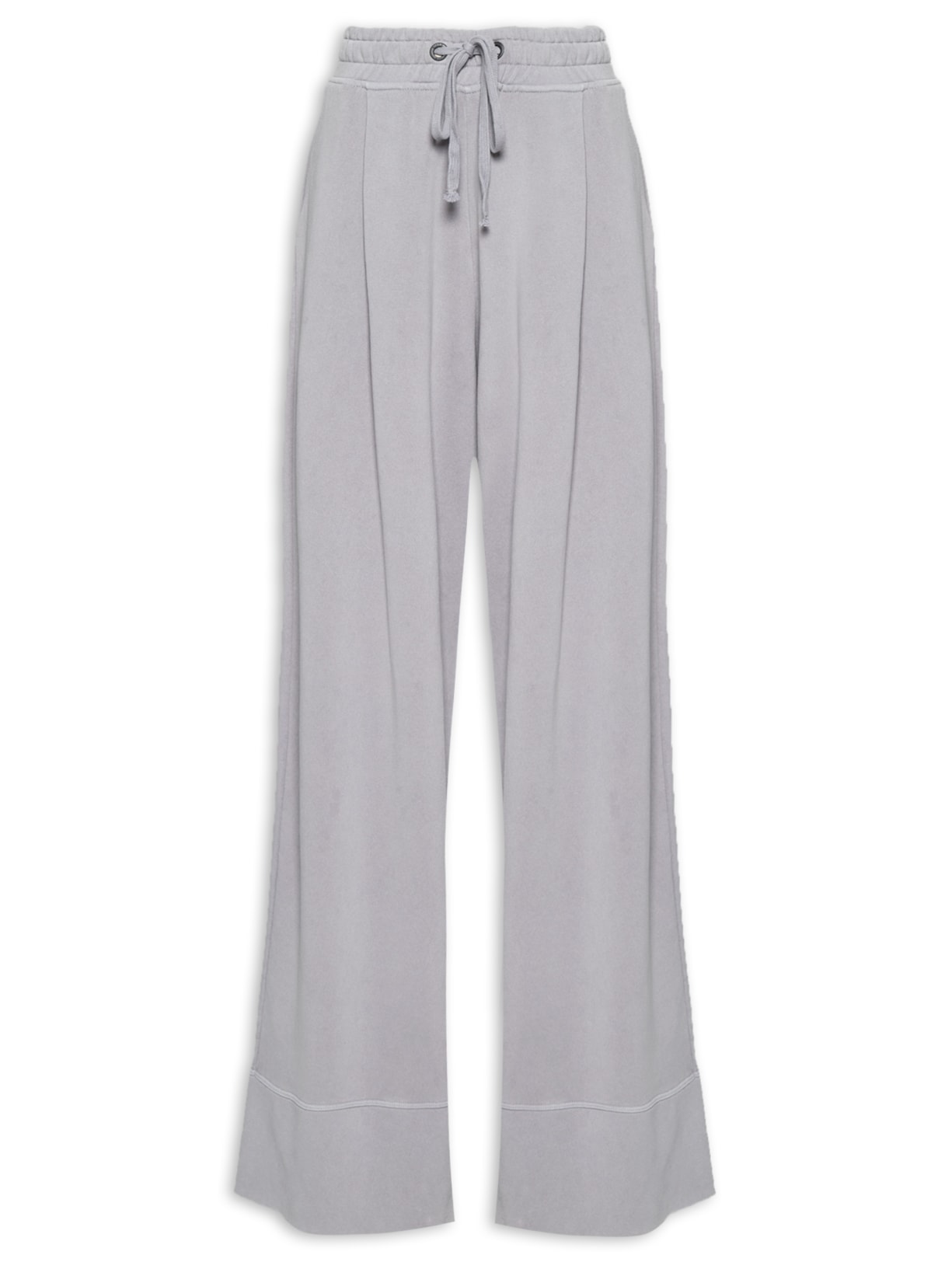 A calça cinza é confeccionada em moletom de baixa elasticidade. A peça solta ao corpo possui cintura alta, cós com elástico e tiras alongadas embutidas para ajuste e amarração frontal, bolsos frontais de modelo faca, bolsos posteriores, barra estendida e comprimento longo.