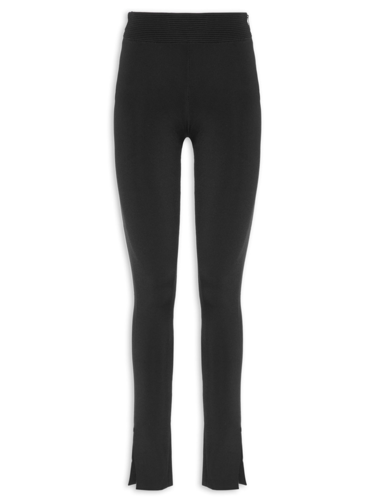 A calça preta é confeccionada em tricot encorpado de média elasticidade. A peça justa ao corpo possui cintura alta, cós amplo canelado, barra com fendas laterais, comprimento longo e fechamento lateral em zíper.