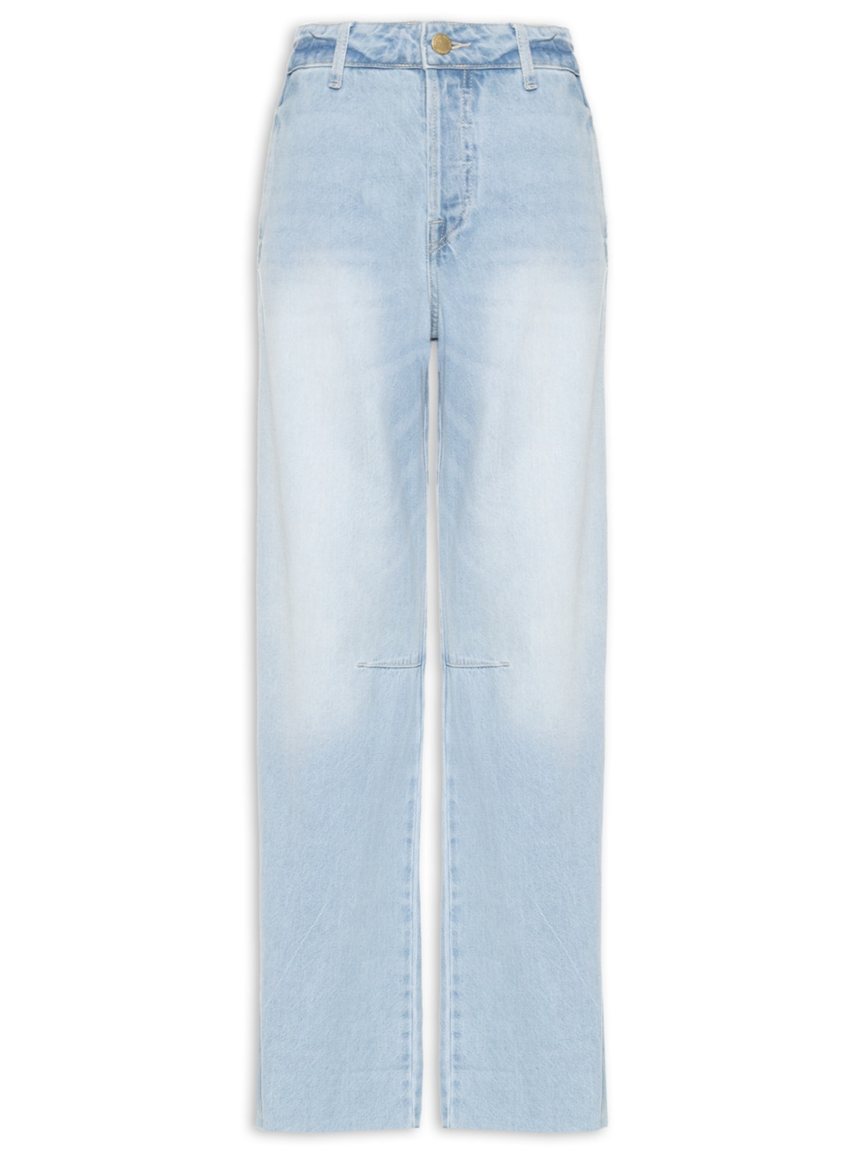 A calça azul é confeccionada em sarja com lavagem em jeans sem elasticidade. A peça solta ao corpo possui cintura alta, cós com passantes aplicados, bolsos frontais embutidos, bolsos posteriores, tag da marca aplicada na parte posterior, efeito estonado, recorte na altura do joelho, comprimento longo, barra com acabamento em corte à fio e fechamento frontal por botões com vista sobreposta.