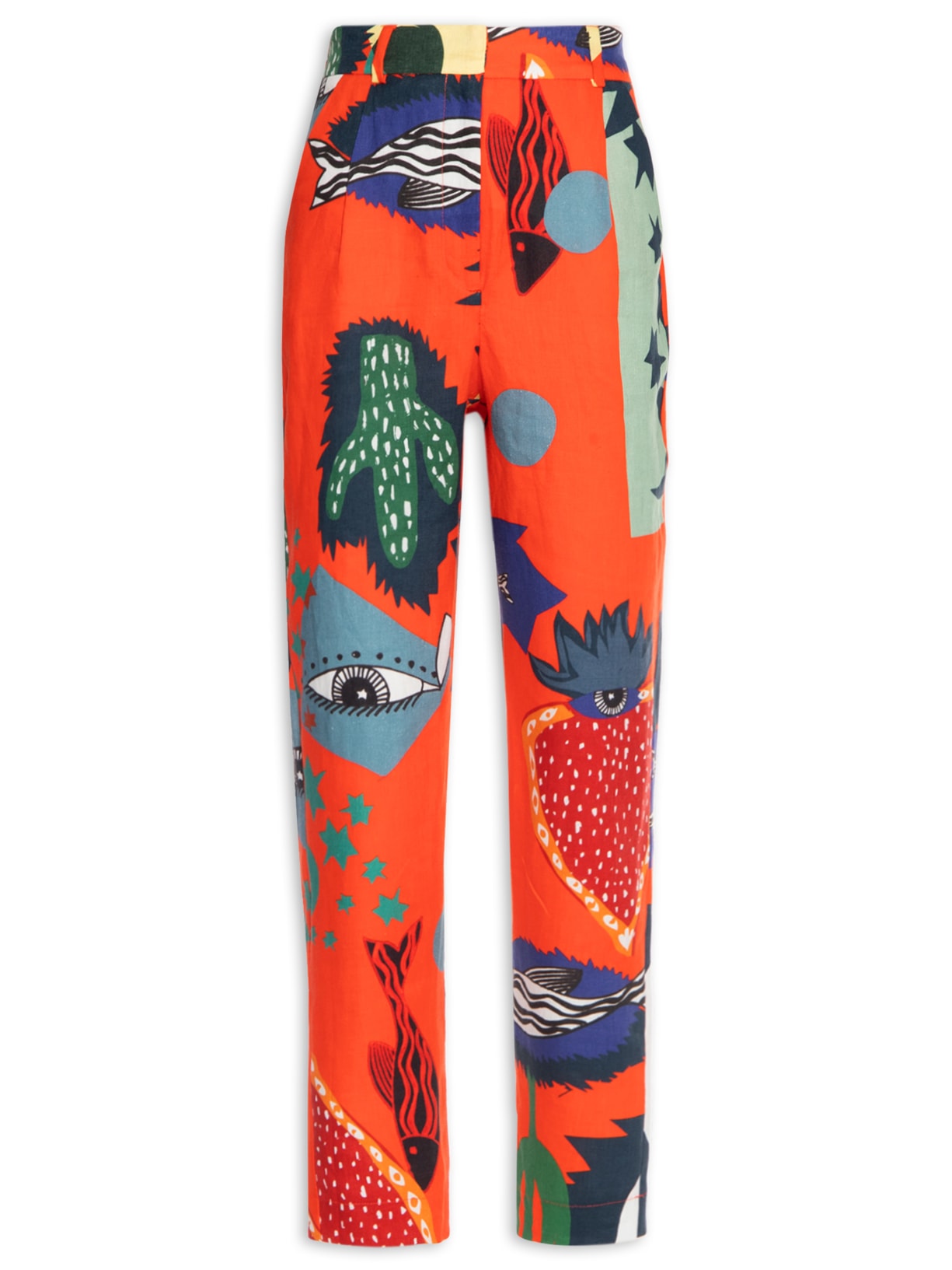 A calça vermelha é confeccionada em linho. A peça possui cintura alta, cós com passantes, bolsos posteriores decorativos, tag da marca aplicada em metal na parte posterior na altura do bolso, pregas frontais na altura do cós, bolsos frontais modelo faca, mix de estampas com cores contrastantes, comprimento cropped*, shape solto, caimento reto, acabamento pespontado e fechamento frontal por botão, colchetes e zíper com vista sobreposta.
