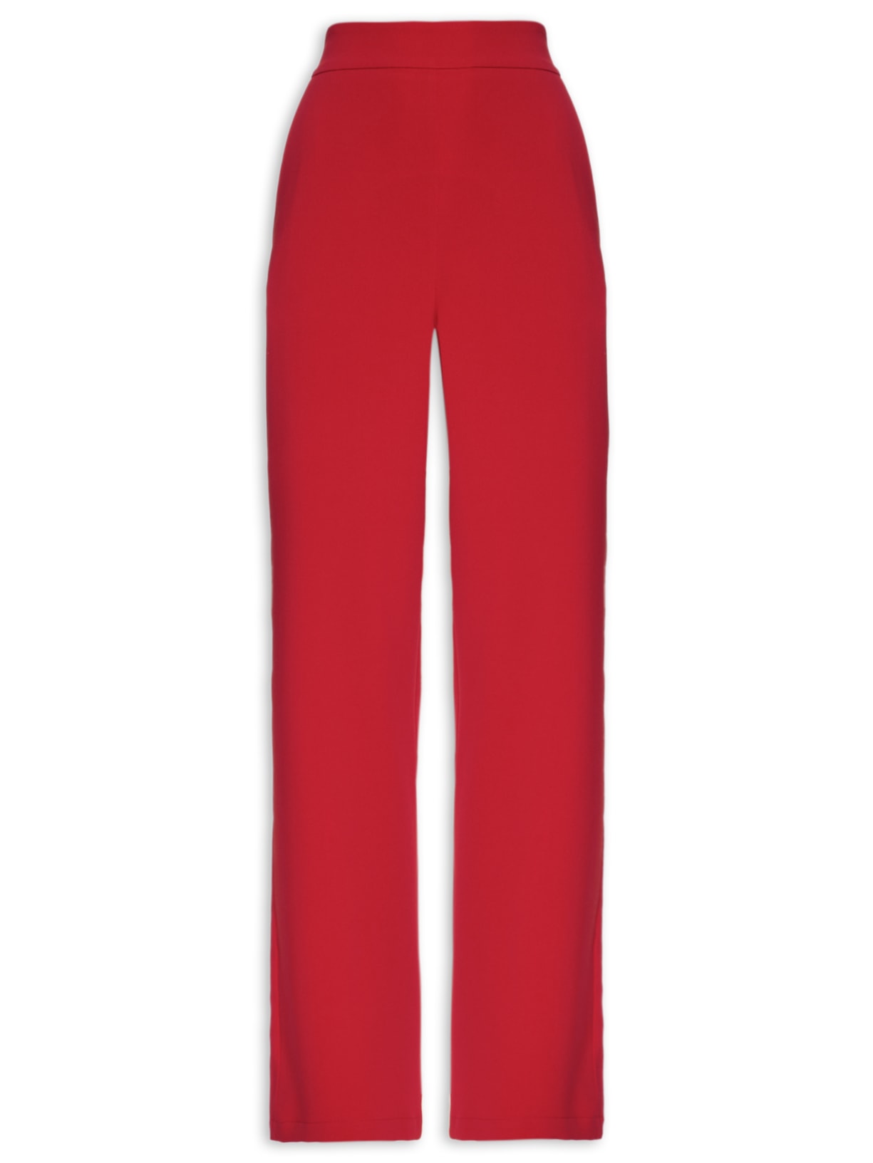 A calça vermelha é confeccionada em tecido leve sem elasticidade. A peça solta ao corpo possui cintura alta, tag da marca em metal aplicada na parte posterior abaixo do cós, bolsos frontais modelo faca, bolsos posteriores decorativos, pences posteriores, comprimento longo e fechamento lateral por zíper invisível.