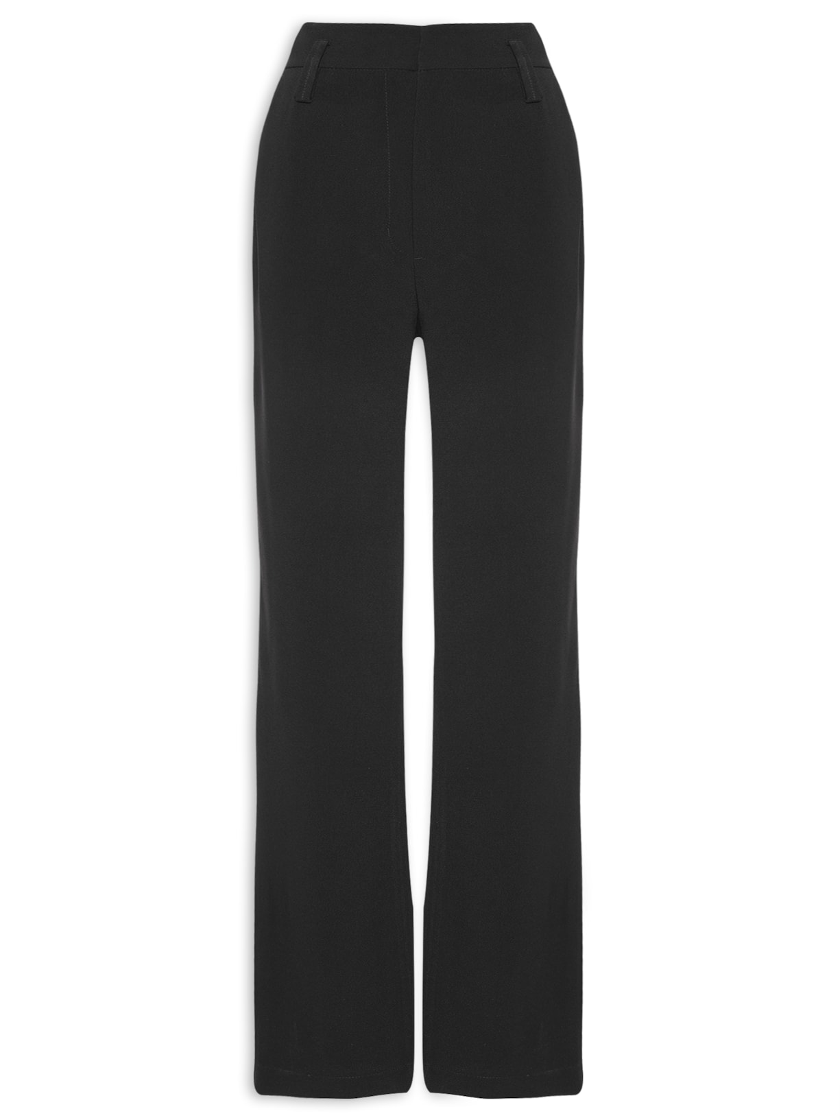 A calça preta é confeccionado em crepe sem elasticidade. A peça solta ao corpo possui cintura alta, cós com passantes aplicados, bolsos frontais modelo faca, bolsos decorativos e pences na parte posterior, forro, comprimento longo e fechamento frontal por botão, colchetes e zíper.