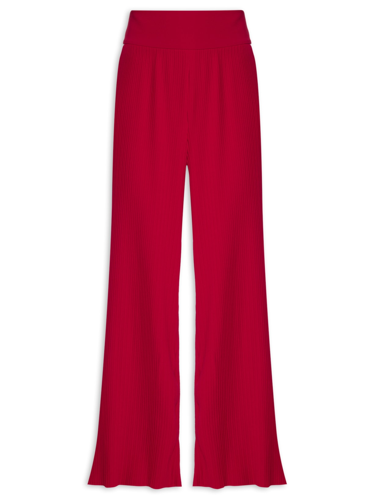 A calça vermelha é confeccionada em tecido encorpado com superfície plissada de baixa elasticidade. A peça solta ao corpo, possui cintura alta, cós largo, comprimento longo e fechamento lateral por zíper invisível.