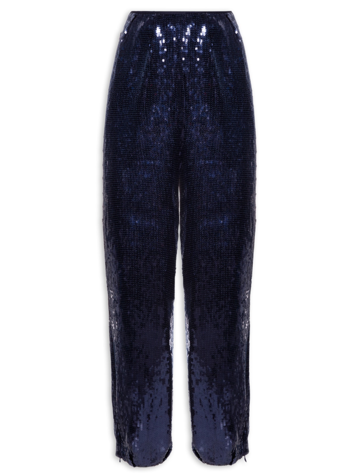 A calça azul é confeccionada em tecido leve com superfície em paetês e sem elasticidade. A peça solta ao corpo de modelo jogger* possui cintura alta, pregas frontais, pences posteriores, lateral com zíper aplicado próximo a barra, forro, comprimento cropped** e fechamento lateral em zíper invisível.