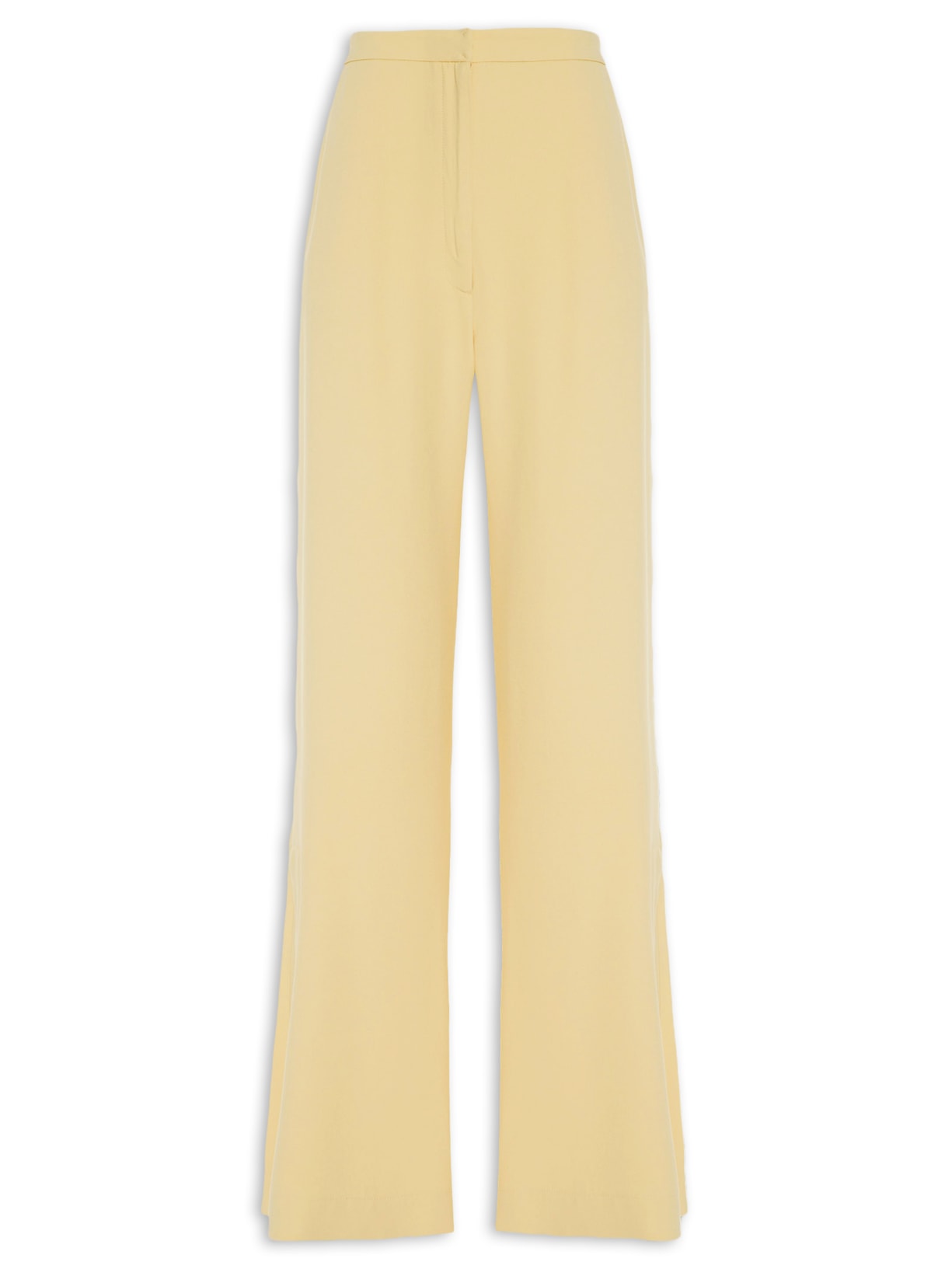 A calça amarela é confeccionada em crepe. A peça possui cintura alta, bolsos frontais de modelo faca, bolsos posteriores decorativos, pences posteriores, fendas frontais, comprimento longo, shape solto, caimento reto, acabamento pespontado e fechamento frontal por botão, zíper e colchete.