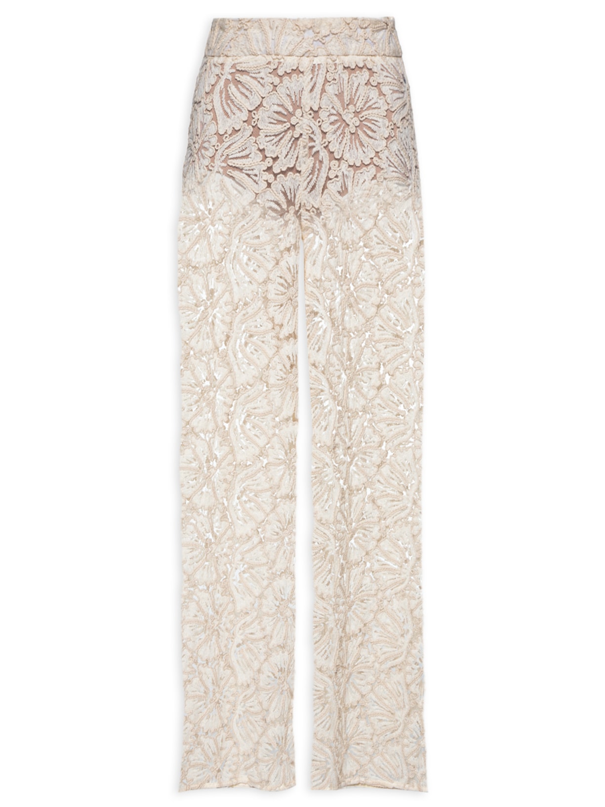 A calça off white é confeccionada por renda sem elasticidade. A peça solta ao corpo de modelo pantacourt* possui cintura média, leve transparência, fechamento lateral pro zíper e forro.