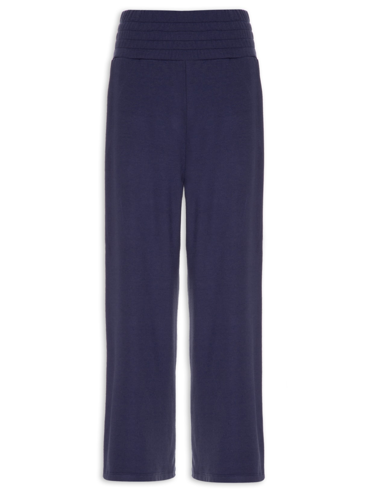 A calça azul marinho é confeccionada em malha encorpada com alta elasticidade. A peça solta no corpo, de modelo pantacourt*, possui cintura alta, cós amplo com elástico embutido, bolsos frontais modelo faca e tag metálica da marca aplicada na parte posterior abaixo do cós.