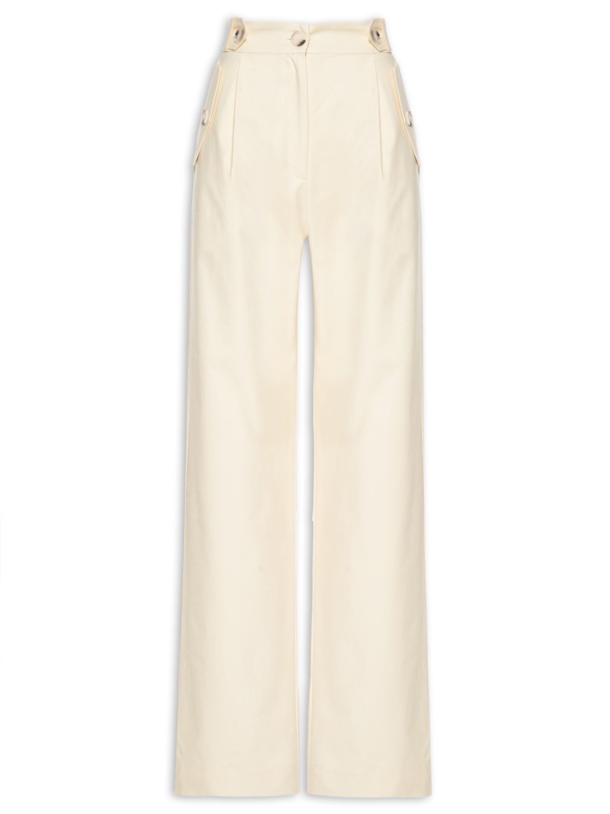 A calça bege é confeccionada em tecido encorpado de baixa elasticidade. A peça solta ao corpo, possui cintura alta, cós com passantes aplicados, tias aplicas no cós com botão, pregas frontais, bolsos faca frontais com aba decorativa e botão aplicado, bolsos posteriores embutidos, comprimento longo e fechamento frontal por zíper e botão.