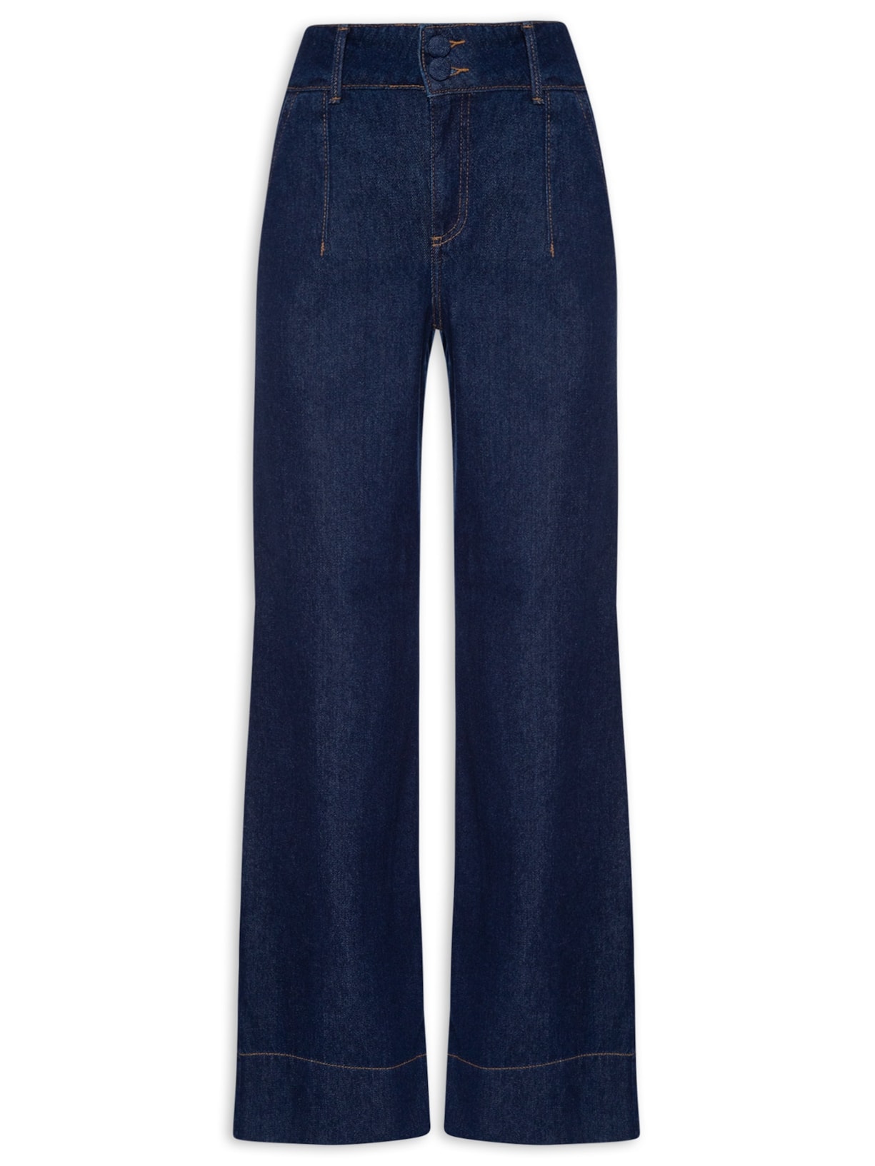 A calça azul é confeccionada em sarja com lavagem em jeans sem elasticidade. A peça solta ao corpo de modelo pantalona possui cintura alta, passantes aplicados no cós, bolsos frontais no modelo faca, bolsos posteriores com tag da marca metalizada aplicada, pences frontais e posteriores, fechamento por zíper e botão frontal e comprimento longo.