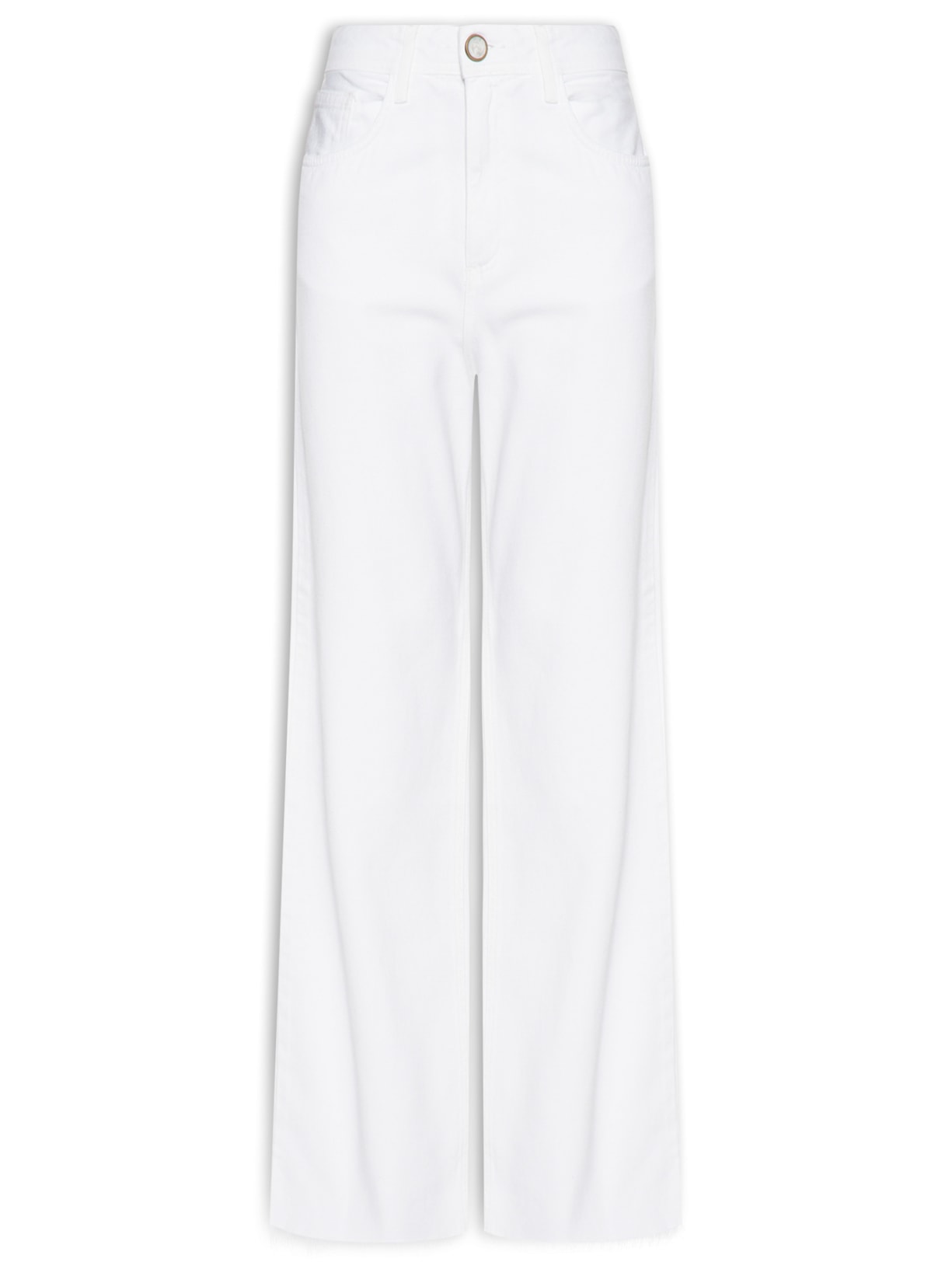 A calça branca é confeccionada em sarja sem elasticidade. A peça solta ao corpo de modelo pantalona possui cintura alta, cós com passantes aplicados, five pockets* com rebites metálicos na parte frontal e tag da marca na parte posterior, recorte posterior, barra com corte a fio, comprimento longo e fechamento frontal em zíper e botões.