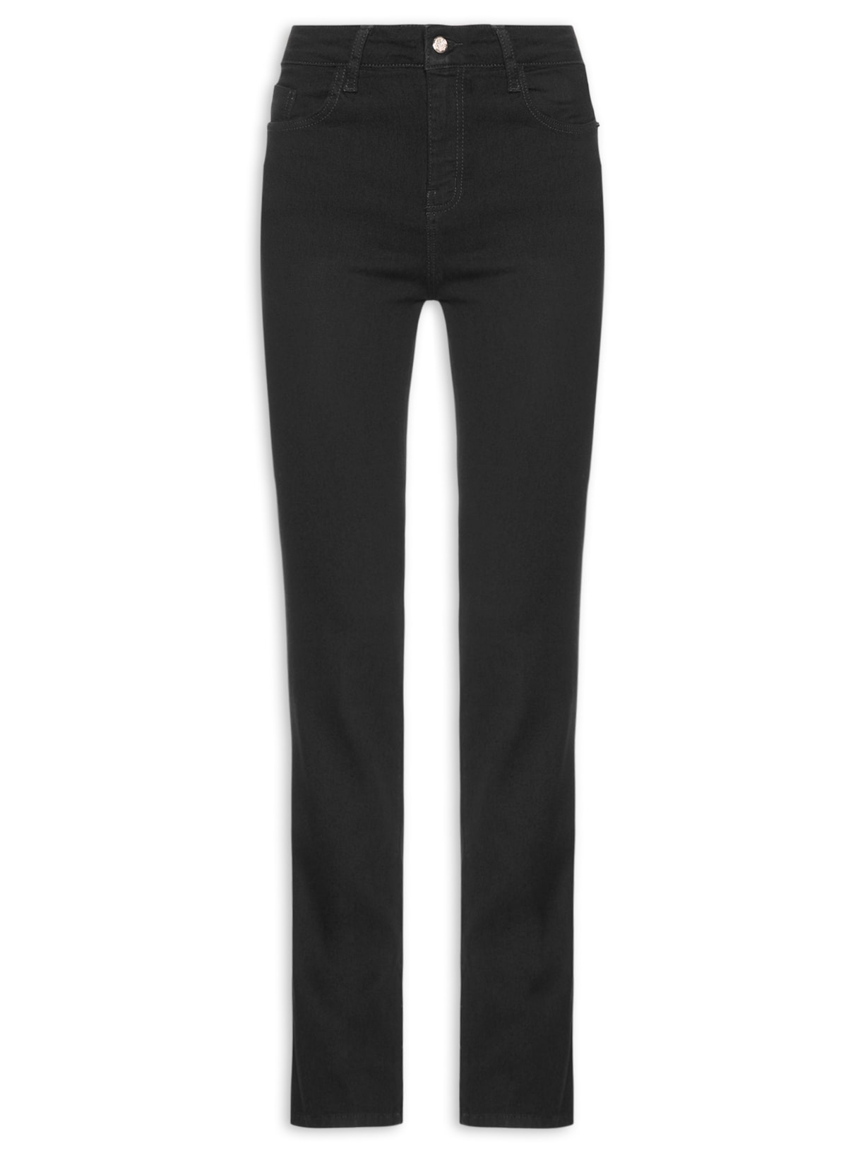 A calça preta é confeccionada em sarja com baixa elasticidade A peça de modelo reta solta ao corpo possui cintura alta, cós com passantes, recorte posterior, five pockets*, logo da marca aplicado em metal no bolso posterior, comprimento longo e fechamento frontal por botão e zíper.